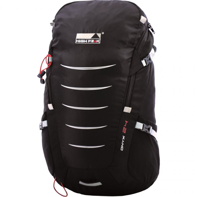 HIGH PEAK ONYX 24 BACKPACK /30188 The high-quality ONYX 24 backpack from High Peak is ideal for both hiking and everyday use. It contains two large storage compartments. The entire volume is also optimally adjusted using compression straps. All straps, including the shoulder and hip straps, are individually adjustable and softly padded. An air channel system prevents back sweating. The backpack is prepared for a hydration reservoir. A rain cover provides additional protection in changing weather, even while traveling. Parameters: Capacity: 24 L Weight: 930 g Material: Polyester