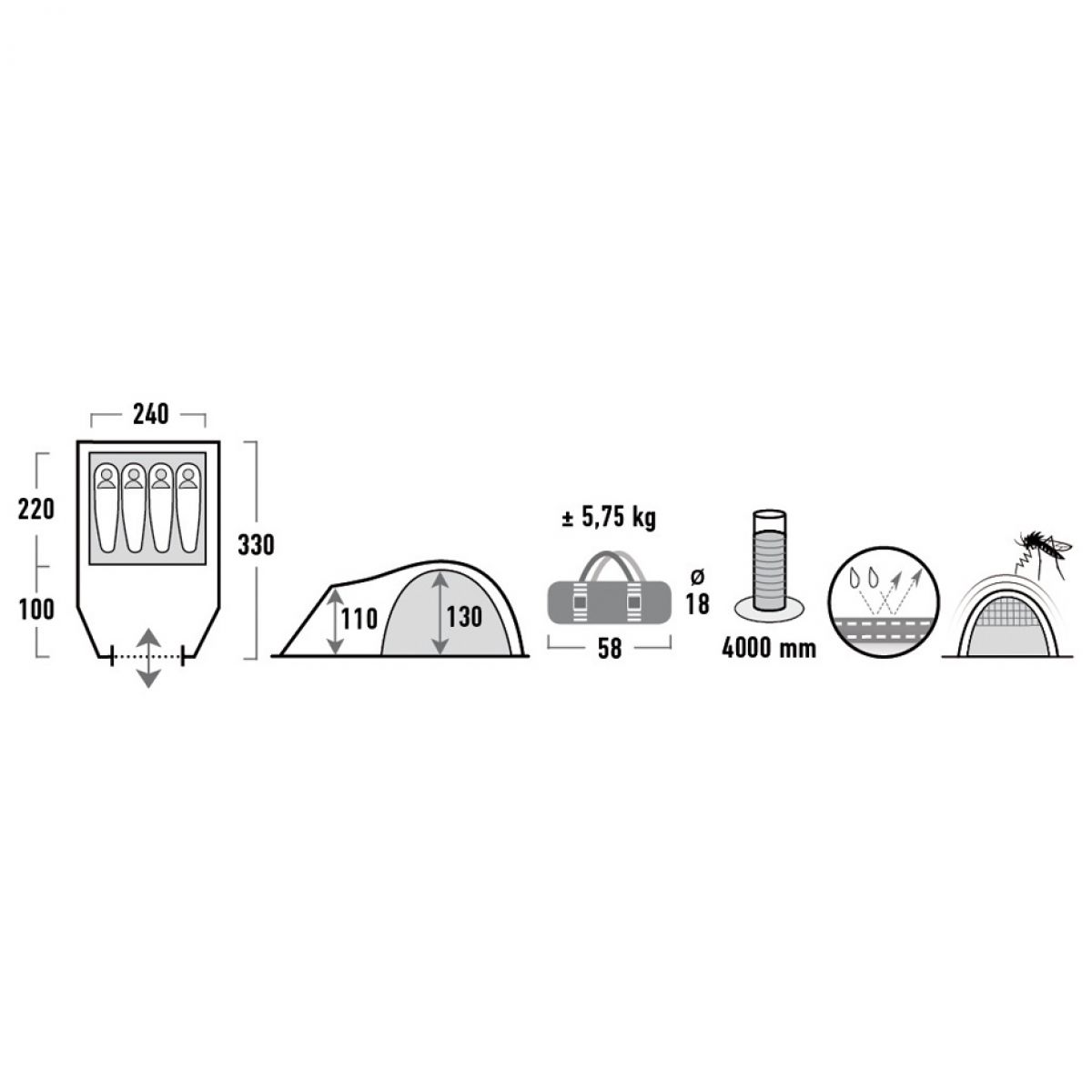 - The entrance is equipped with a mosquito net to protect against insects. Laminated seams and a 3000mm waterproof rating guarantee excellent protection against rain. Double-layered.