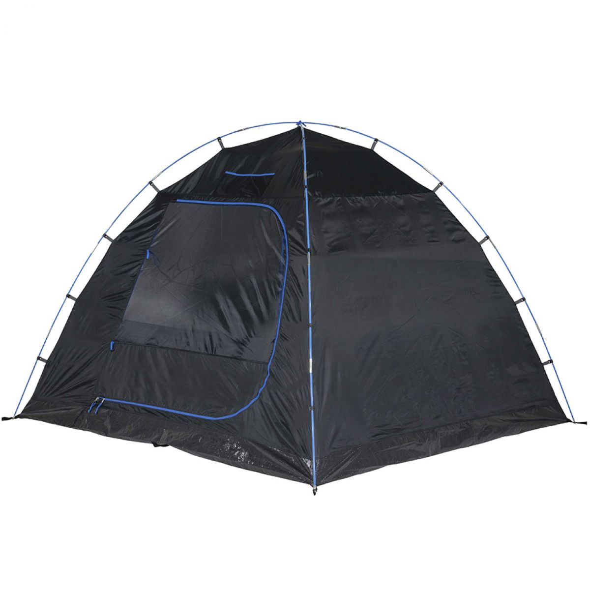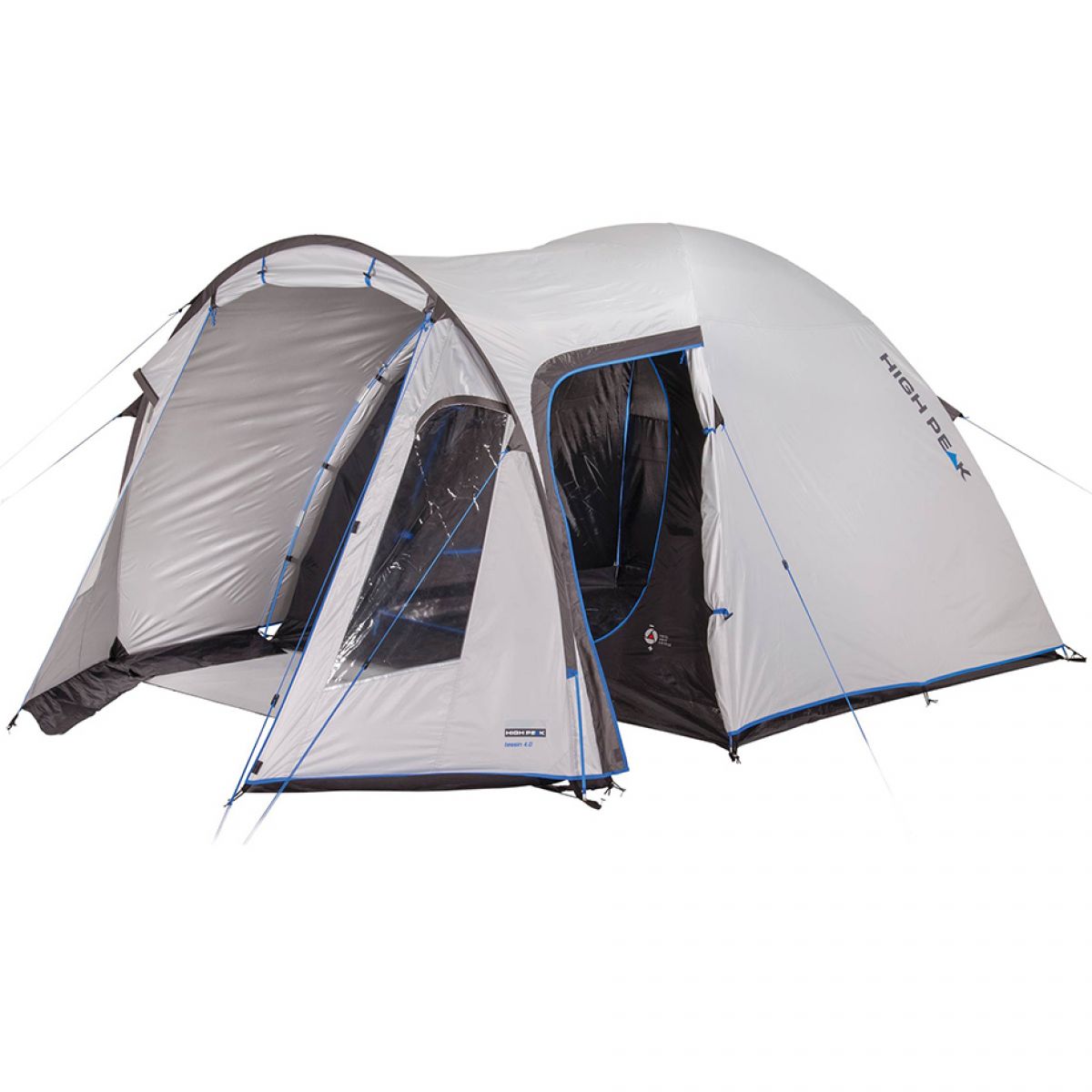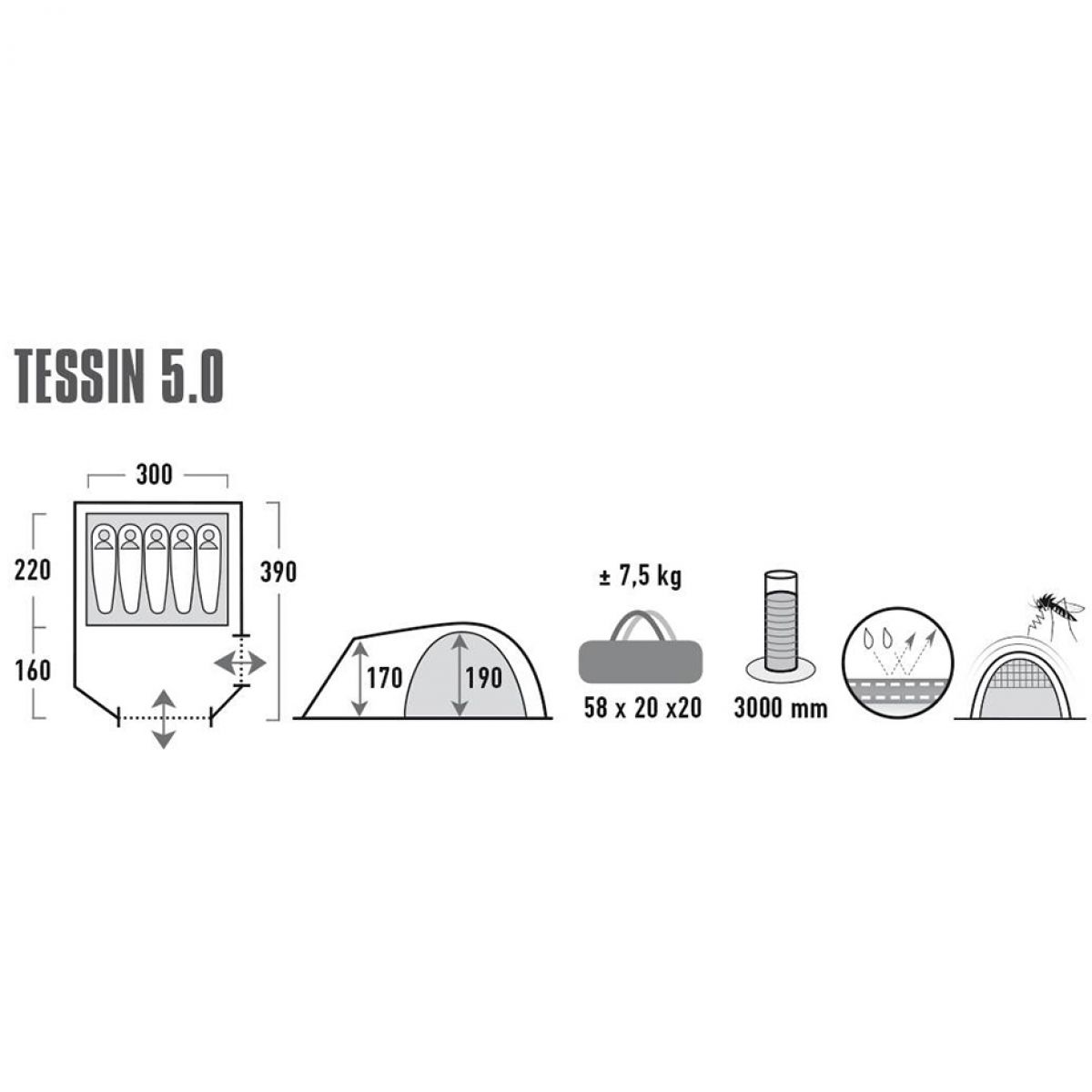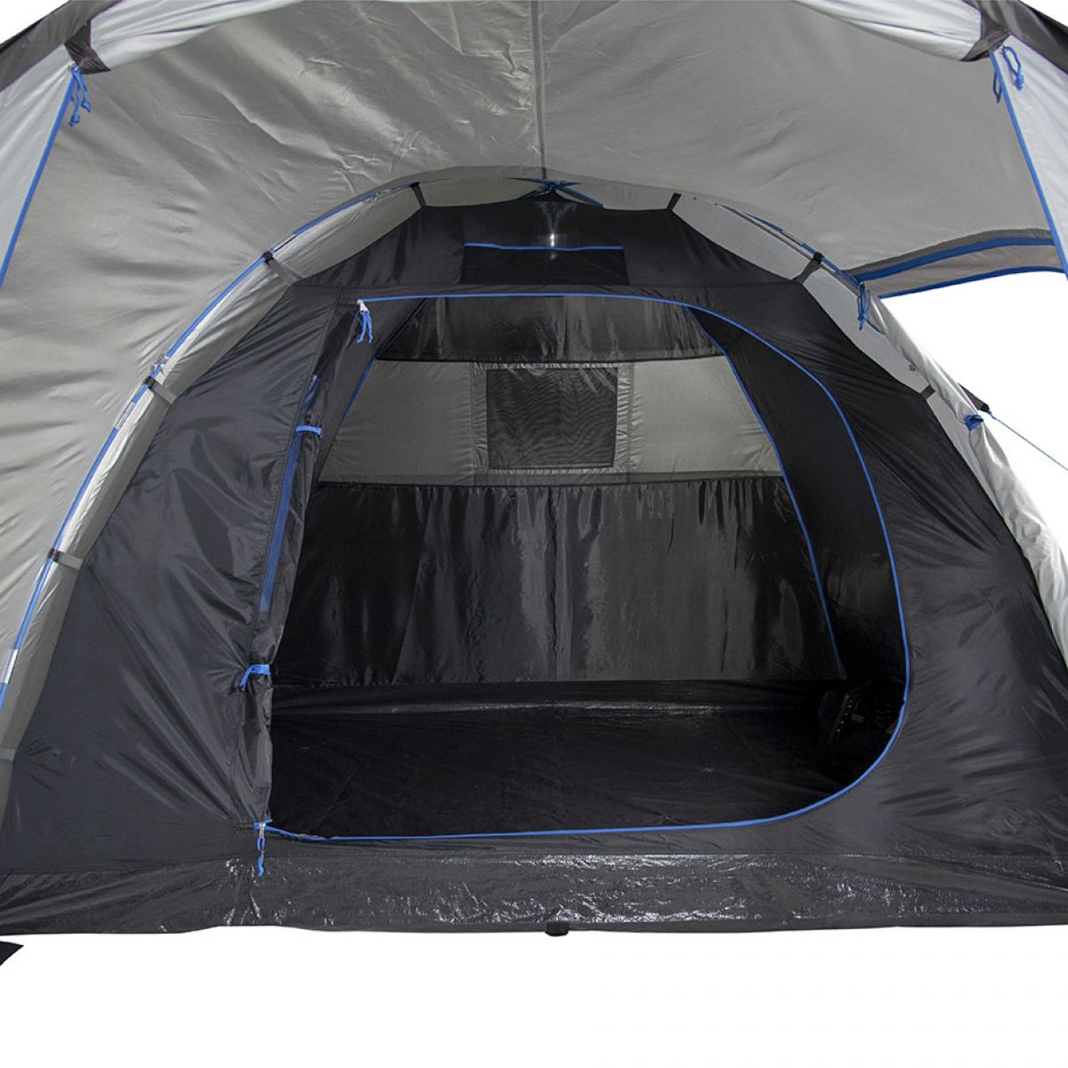 A family tent with two entrances – front and side. Ventilation openings. A spacious vestibule can be used as a kitchen or utility room. The entrance is equipped with a mosquito net. Laminated seams and a 3000mm waterproof rating. Double-walled in the sleeping area. Packed in a carry bag. Lamp holder. Vario Vent Control technology allows for ventilation.