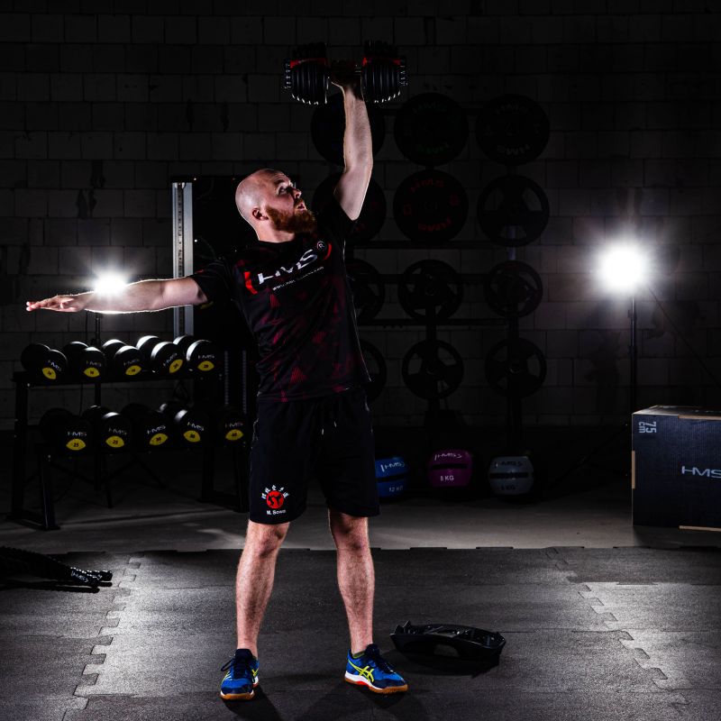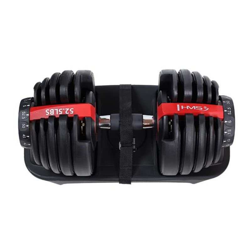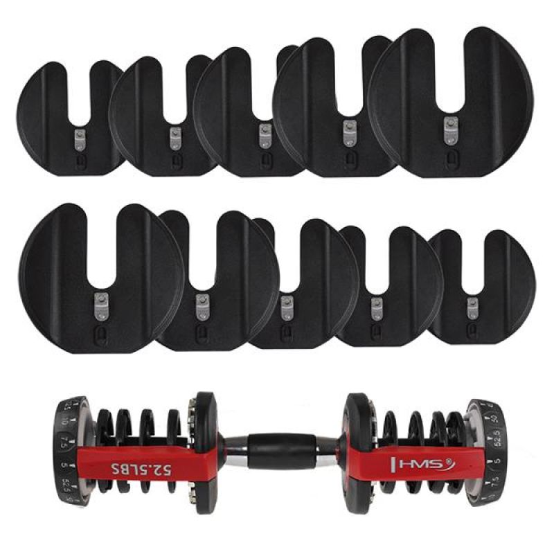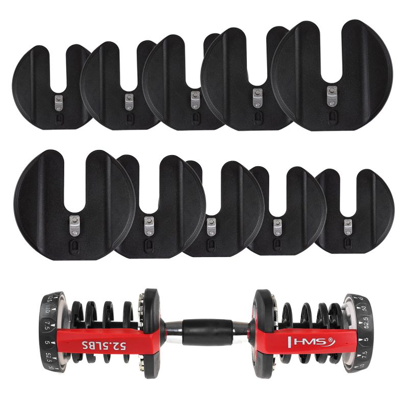 The SR52 HMS is an adjustable dumbbell. The set includes a bar, 10 plates, and a stand. This device is ideal for home workouts, but it can also be used in the gym, replacing an entire rack of traditional dumbbells. An innovative plate mounting system allows for quick and easy weight changes during a workout. Unlike traditional dumbbells, removing and attaching the plates does not require the need to loosen the clamps or attach and remove the plates each time. With the SR52, simply place the barbell on the stand and use two knobs to set the desired weight. When you lift the barbell again, the plates corresponding to the selected setting will be on it. The product is made of the highest quality materials. A major advantage of the SR52 HMS is the ergonomically shaped handle covered with non-slip material. HMS adjustable dumbbells are an innovative solution for strength sports enthusiasts – 10 plates allow for flexible weight adjustments depending on the user's needs.