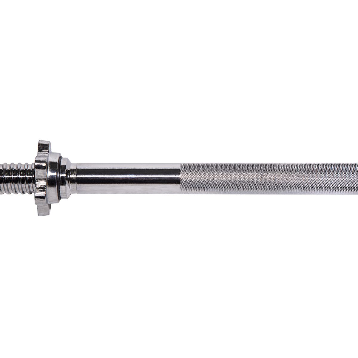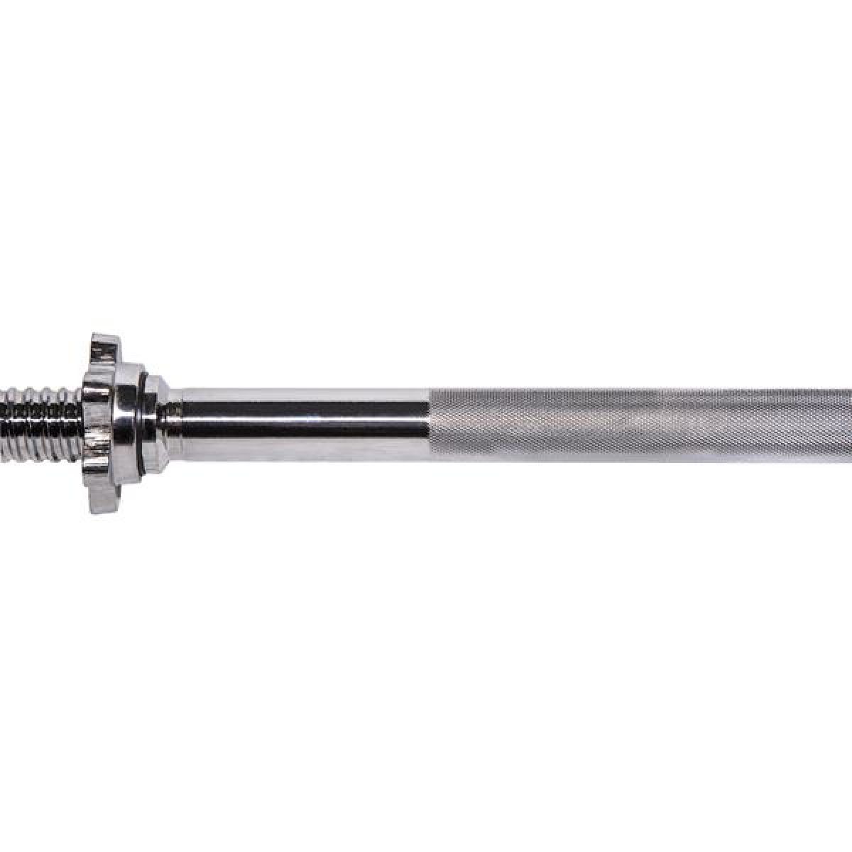 The GP 120cm HMS is a straight bar with star clamps. Its gripping section is carefully knurled to ensure a secure and comfortable hold. Two screw clamps are included. These clamps ensure a stable weight position on the bar during exercise. The nuts on the inner section have rubber seals to prevent the weight from loosening. The threaded section of the bar allows for quick and safe weight placement. The device is made of a solid steel bar that has been hardened. The bar's 30-millimeter diameter ensures high durability and comfortable exercise. The chrome-plating process ensures the bar retains its appearance for a very long time and also provides the best protection against rust.