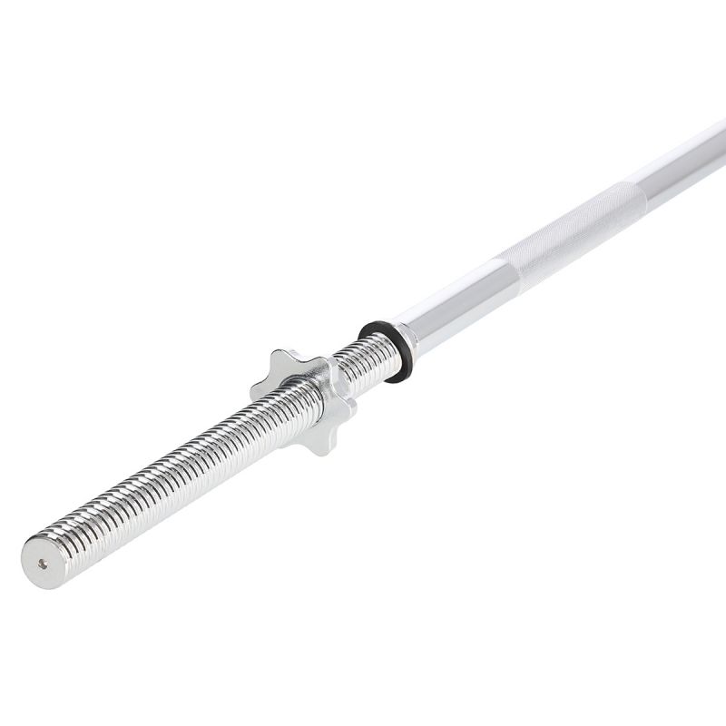 The GP 200cm HMS is a straight bar with star clamps. Its gripping section is carefully knurled to ensure a secure and comfortable hold. Two screw clamps are included. These clamps ensure a stable weight position on the bar during exercise. The nuts on the inner section have rubber seals to prevent the weight from loosening. The threaded section of the bar allows for quick and safe weight placement. The device is made of a solid steel bar that has been hardened. The bar's 30-millimeter diameter ensures high durability and comfortable exercise. The chrome-plating process ensures the bar retains its appearance for a very long time and also provides the best protection against rust.