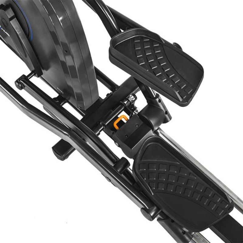 The H1742 HMS PREMIUM elliptical trainer features an internal magnetic braking system. In practice, this means that magnets are responsible for braking the flywheel. Using the built-in computer, you can adjust the load – the motor moves the arm with magnets closer or further away from the flywheel, thereby reducing or increasing the load on the device.