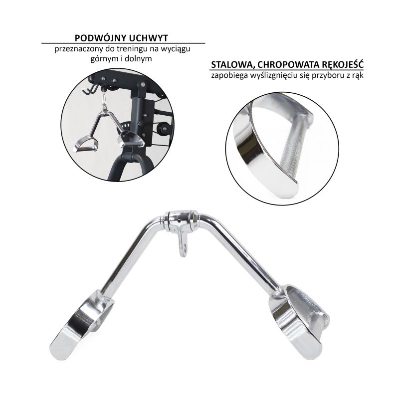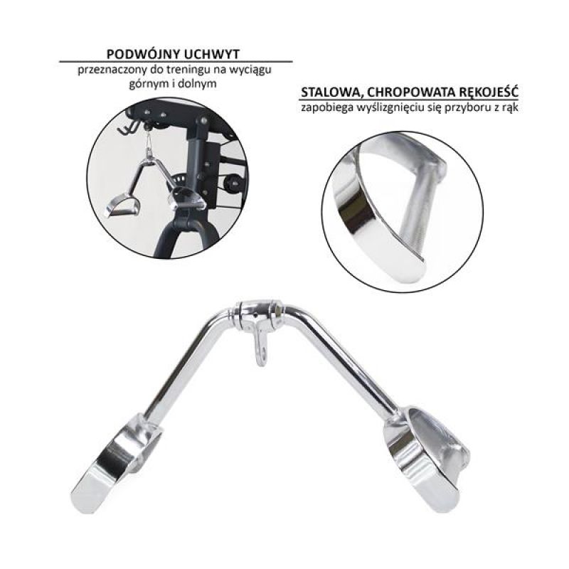 - The handle's design ensures ideal hand positioning and encourages proper movement during exercise. The wide grip allows for exercises at an alternative angle to a narrow grip, allowing for more effective training and full muscle development. It is made of high-quality steel.