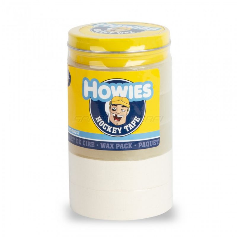 Howies Hockey Tape, Shin Guard Tape, and Wax Pack. Each pack contains: 3 rolls of clear shin guard tape, 2 rolls of stick tape, and 1 can of wax. Features: Clear shin guard tape is flexible, strong, and doesn't leave marks on your socks. The wax prevents snow and ice buildup for improved feel and control. This white/black stick tape is a premium Howies product.