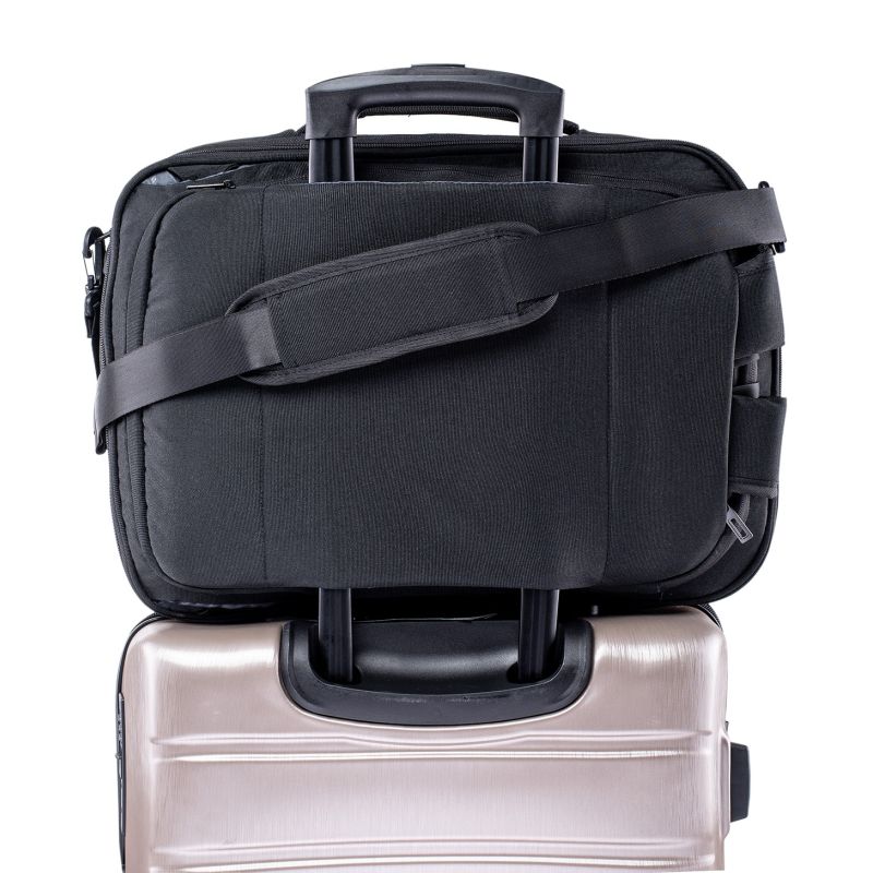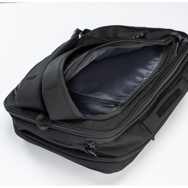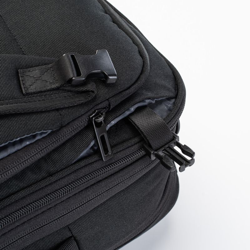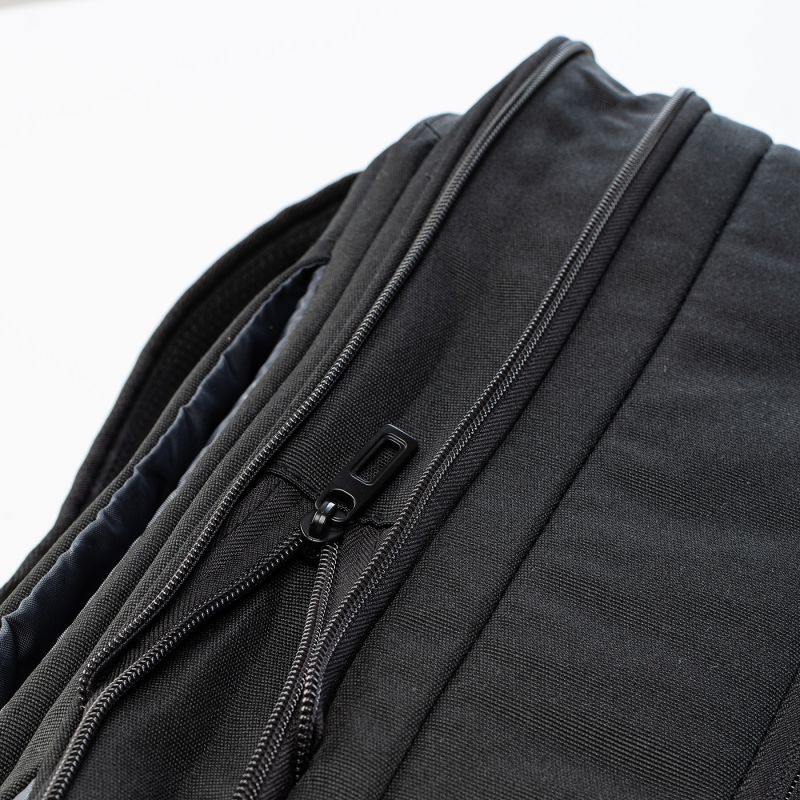 The CALATOR is a backpack for frequent travelers. It has a spacious main compartment, accessible via a side zipper and the main zipper, like a suitcase. Inside, there's an organizer and a small zippered pocket. A detachable, adjustable strap transforms the backpack into a tote bag, which you can carry with the short handle. The CALATOR has a dedicated laptop pocket, allowing you to safely transport your gear. And that's not all. Retractable shoulder straps make it easy to carry the backpack when it's converted into a bag. If you're traveling further, the CALATOR can be attached to a retractable suitcase handle. The front features several pockets. One is waterproof, so you can stash a wet umbrella. The other, lined with soft material, can hold sunglasses and a power bank. Another can hold other essentials for travel or meetings. The CALATOR – one backpack, many uses!