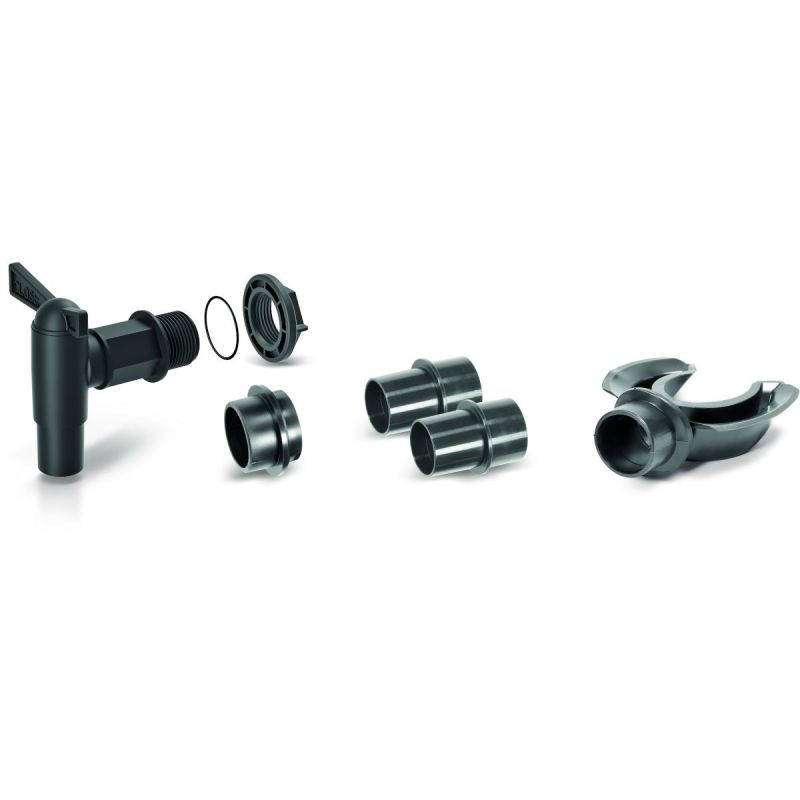 - The set consists of: collector, reducer connecting the hose with a seal, reducer connecting the hose with the water collector, seal, tap