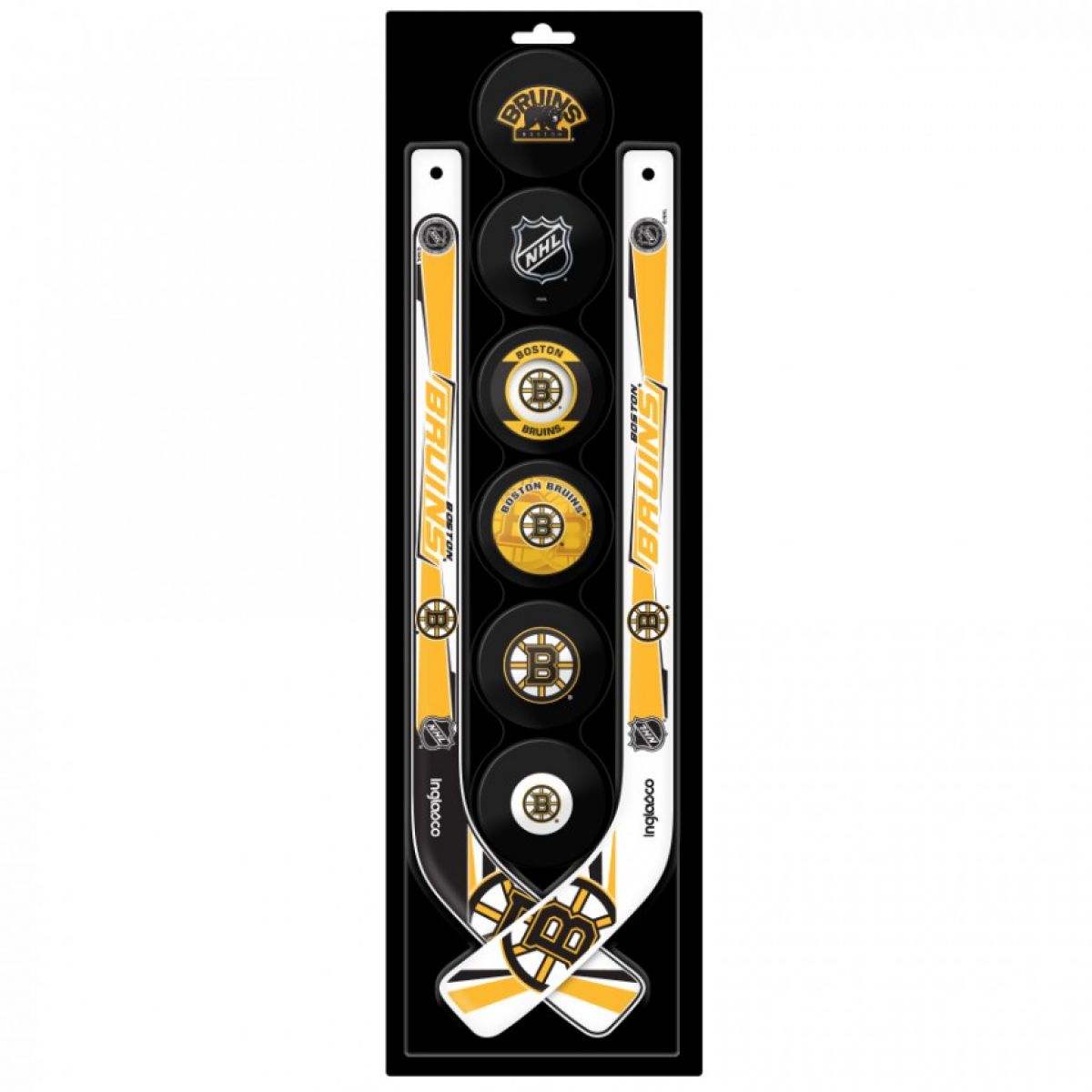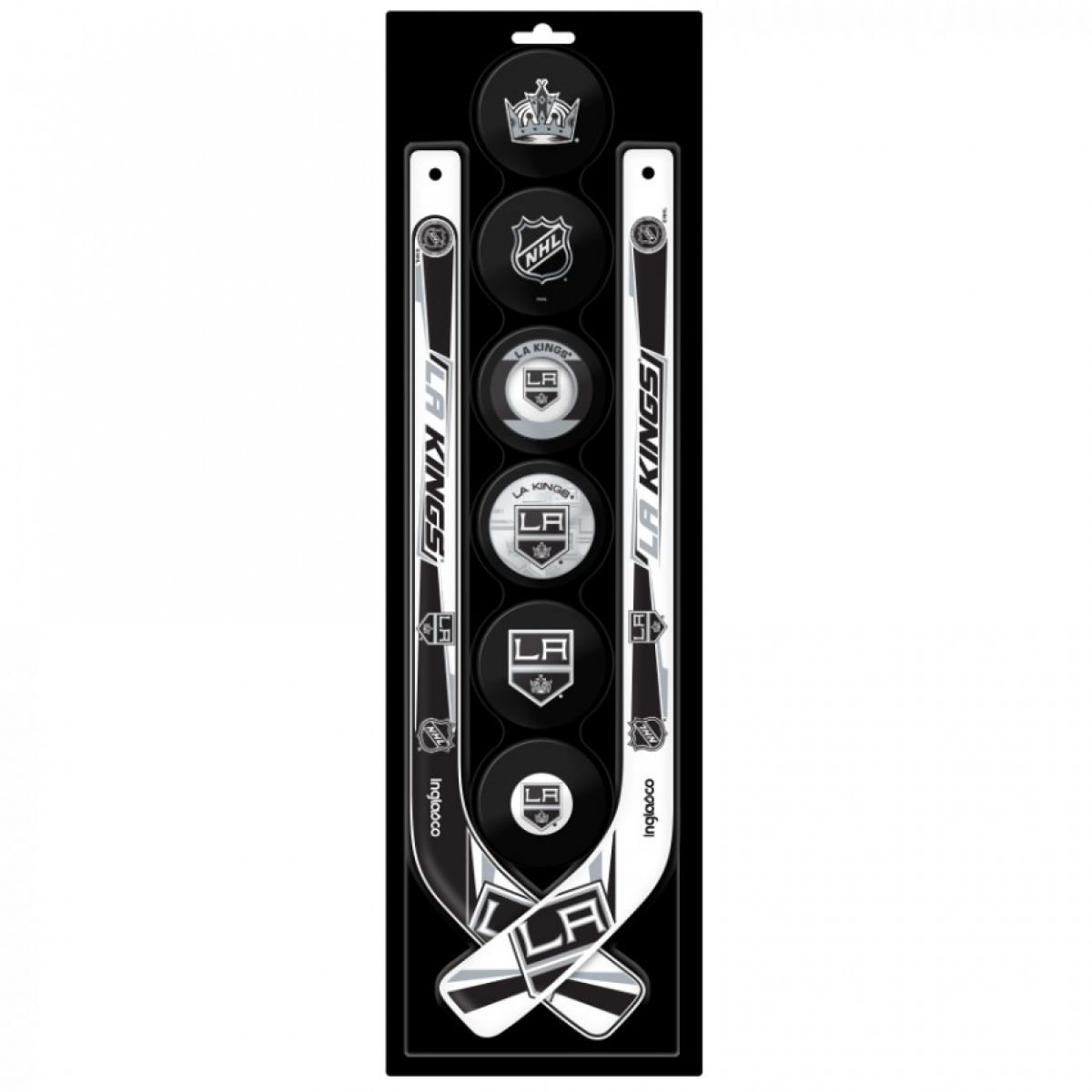 Inglasco NHL 6-Pack Game Set. This set includes 6 foam pucks and two mini sticks. Perfect for hockey players who want to support their favorite NHL team. The sticks have a straight blade, so players can play with either hand! Each foam puck features a different logo design from your favorite NHL team. Officially licensed NHL Canada product. Shaft length: 14" (35.5 cm). Paddle, Straight. Includes 2 x mini NHL sticks with logo. 6 x NHL foam pucks with logo.