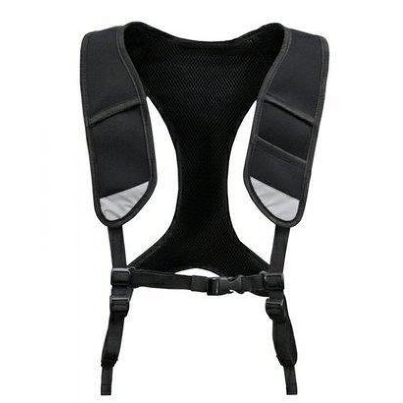 The Lumen Flashing Vest features a four-stage lighting element: steady, flashing, rapid flashing, and off. It's made of soft, stretchy material with a breathable mesh lining. It features an adjustable, elastic chest strap with a snap closure.