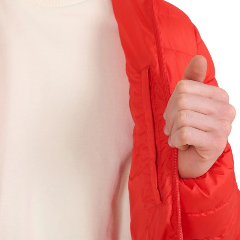 Hydrophobic outer coating - limits moisture absorption Rip stop fabric - increased tear resistance and durability Recycled synthetic filling - effective insulation even in wet conditions Integrated hood without adjustment - head protection against cold and light rain Stand-up collar - additional neck protection against cold