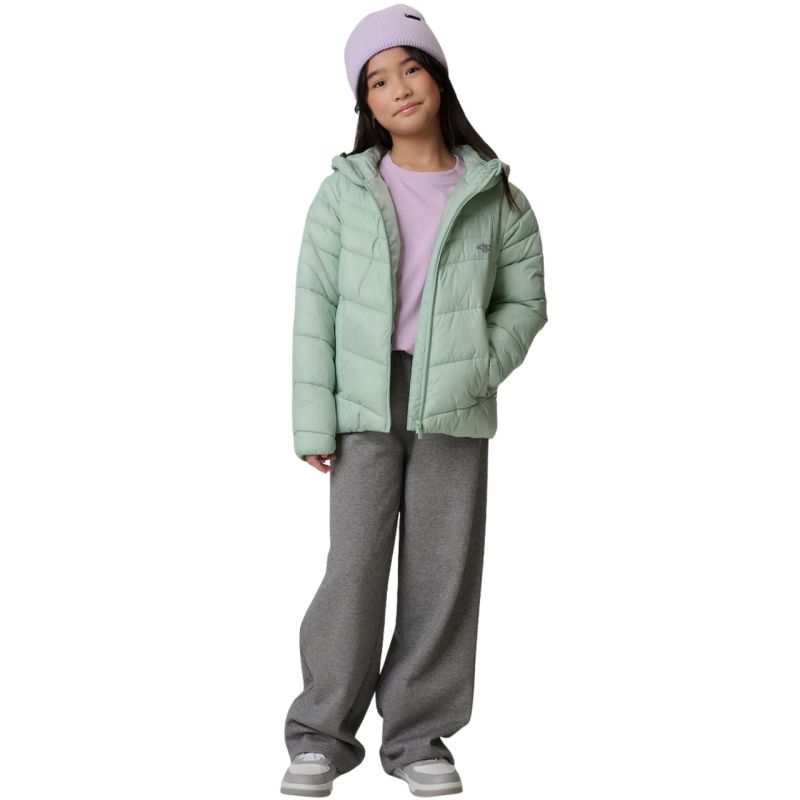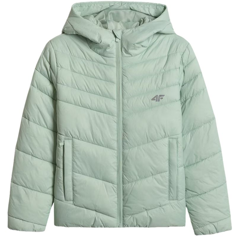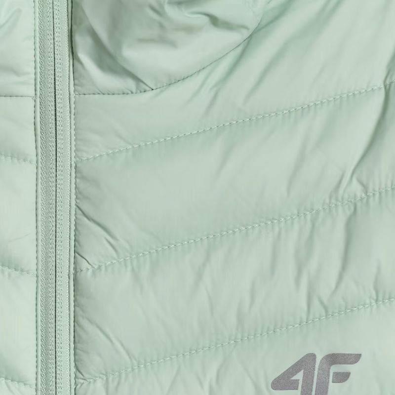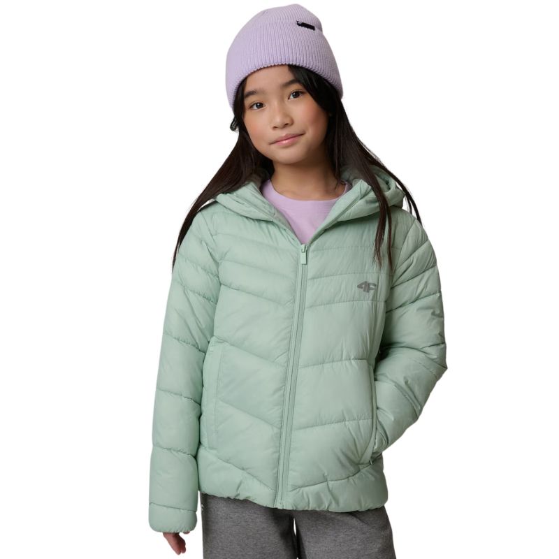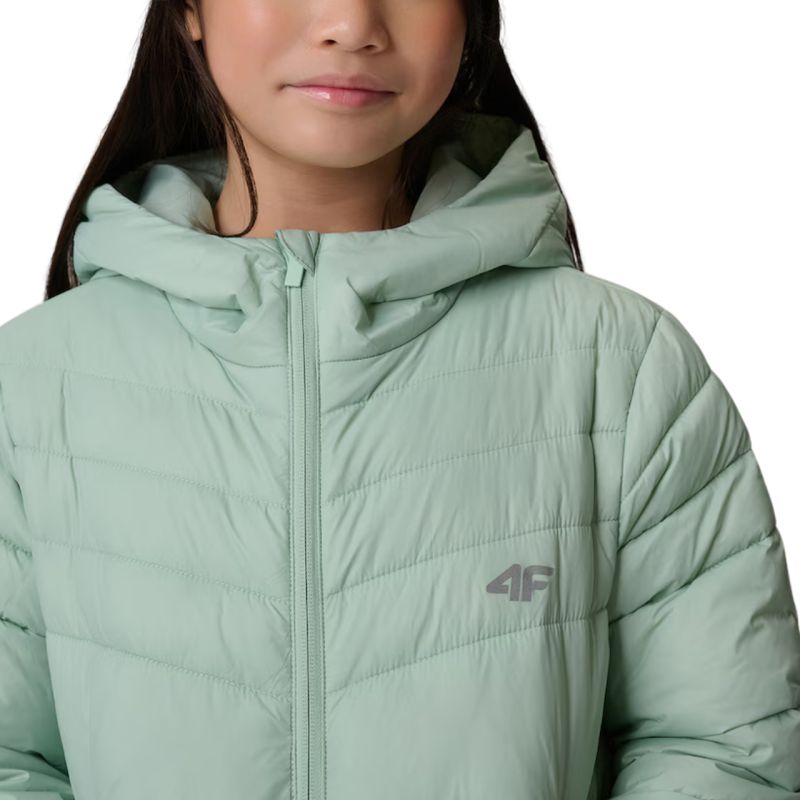 4F F0739 Mint Jacket for Girls 4FJWSS26TDJAF0739 47S A lightweight 4F jacket for girls, designed for the transitional season, featuring 4FWarm technology for thermal comfort on cooler days. Synthetic fill provides excellent insulation, while a hydrophobic coating reduces moisture absorption. It features a hood, zipper, and practical pockets. The regular fit, reaching to the hips, ensures comfort and freedom of movement for everyday wear. Technical data: · Material: 100% polyamide · Lining: 100% polyester · Filling: 100% polyester · 4FWarm technology - supports thermal comfort while wearing · Synthetic filling - provides wrapping without feeling heavy · Hydrophobic impregnation - limits water absorption by the material · Integrated hood - protects the head in windy weather · Zippered pockets - help to safely store small items · Smooth lining - makes it easy to put on over other layers · Regular cut to the hips - ensures comfortable everyday fit