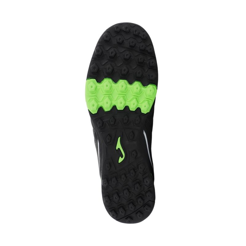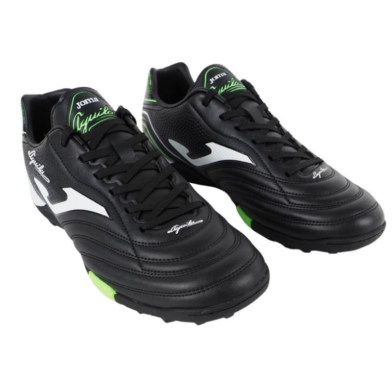 The Joma Aguila 2501 Turf Football Boots in Black and Green AGUW2501TF are perfect for recreational play and training on artificial grass or columbine surfaces. The Fibertech synthetic upper is lightweight and abrasion-resistant. Classic lacing and a stiffened Exo Counter heel counter. The outsole with rubber studs reduces pressure with every step while offering good traction. It's also supported by Durability technology. Specifications: · Durability - increased resistance to wear and abrasion · Exo Counter - stiffened heel counter offers greater stability, protection, and comfort during movement. The inner part is made of microfiber, while the outer part is made of hardened PVC.