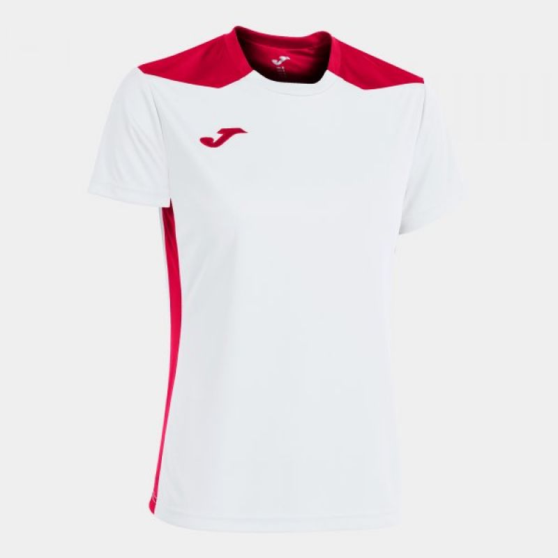- Short-sleeved T-shirt with a round neckline and contrasting colors.