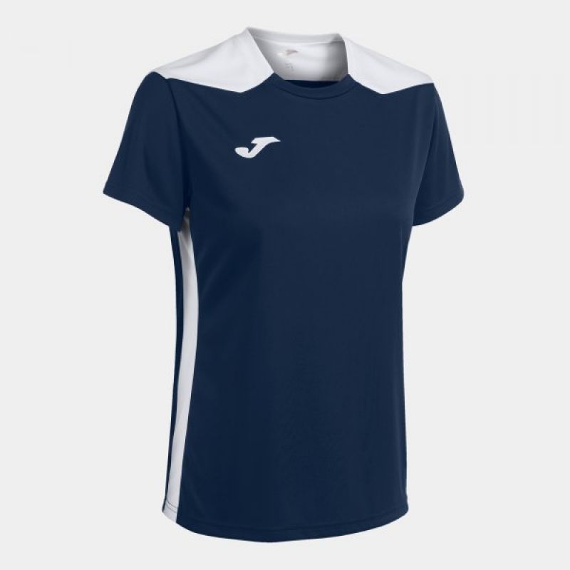 - Short-sleeved T-shirt with a round neckline and contrasting colors.