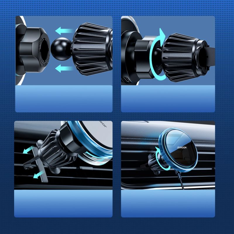An elegant car phone holder with an inductive charger compatible with MagSafe technology - Joyroom knows how to combine design with functionality. The Joyroom JR-ZS291 holder with wireless charging option is equipped with a transparent ring that illuminates blue when you start the car engine. It will certainly fit stylistically into the interiors of modern cars. Inductive charging will charge your phone quickly and safely. The holder has built-in neodymium magnets and special protections that will prevent the devices from overheating. Joyroom JR-ZS291 is also compatible with MagSafe technology, which means you can also charge iPhone 12, 13, 14, 15 series phones with it.