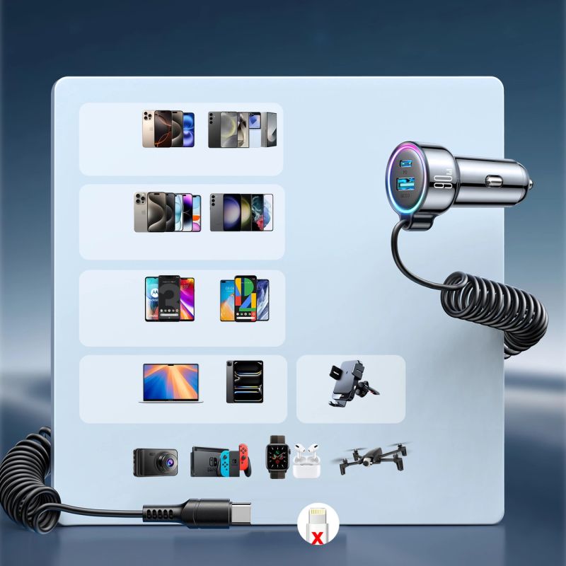 The Joyroom JR-CL07 combines a USB-A port, a USB-C port, and a built-in USB-C cable, allowing you to power three different devices simultaneously – without the need for splitters or adapters.