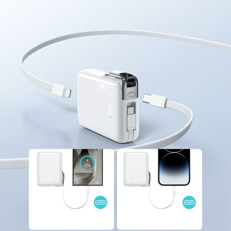 The Joyroom JR-PBF27 Pro is a compact 10,000 mAh power bank with a built-in USB-C cable and an additional USB-C to Lightning cable. It supports fast charging up to 30W, bidirectional power delivery, and an intelligent digital display. It's a practical solution for iPhone and USB-C device users who want a single power bank for everything.