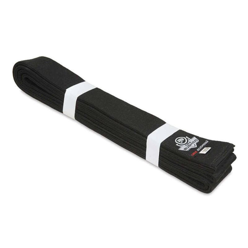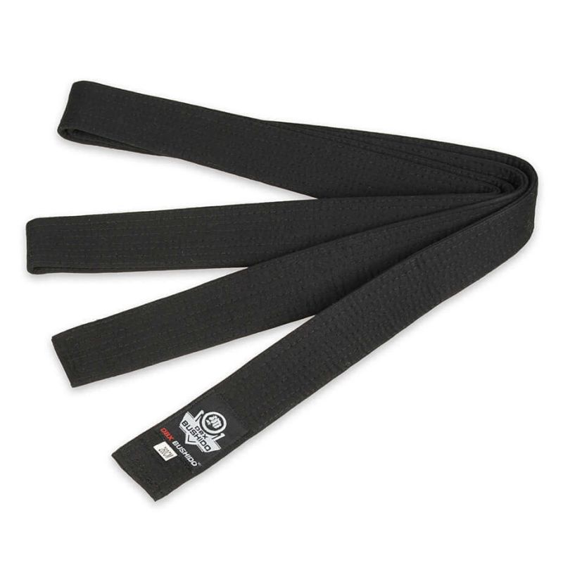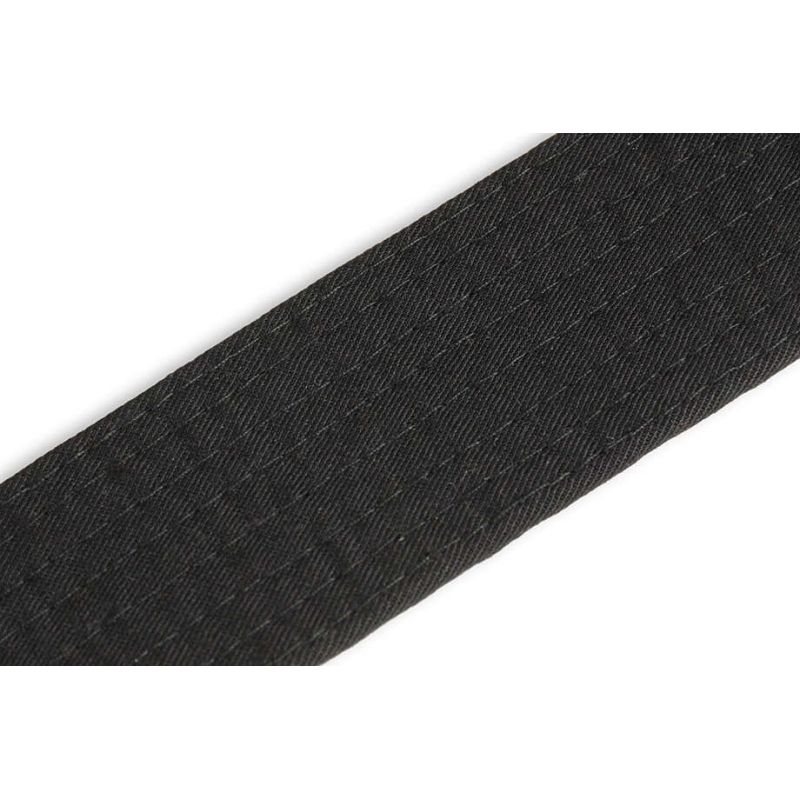 Black belt for martial arts kimonos, made of a material blend of polyester and cotton that provides resistance to abrasion and tearing.