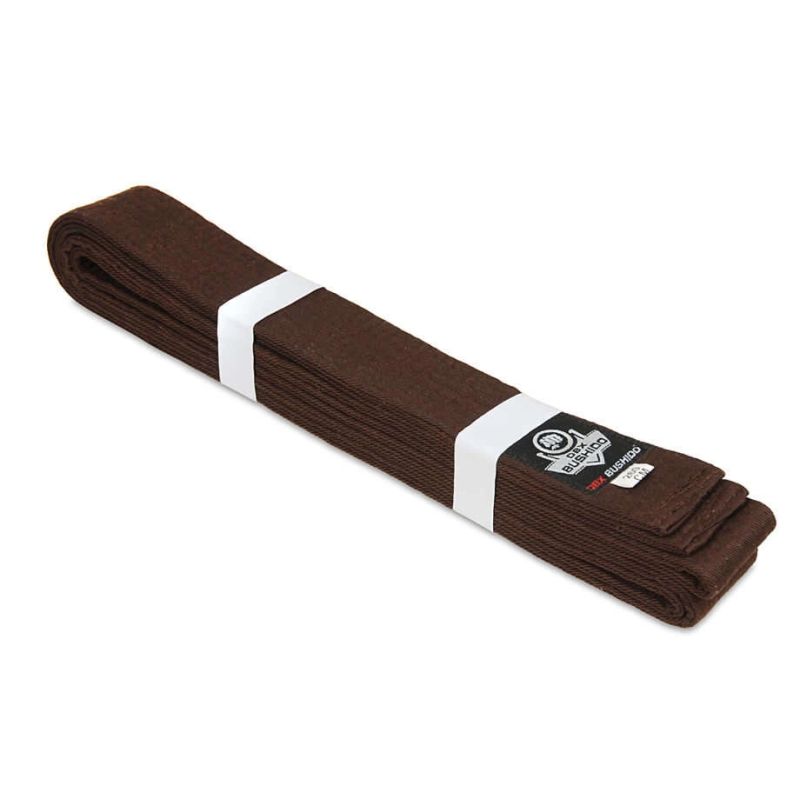 Brown belt for martial arts kimonos, made of a material blend of polyester and cotton, providing resistance to abrasion and tearing.