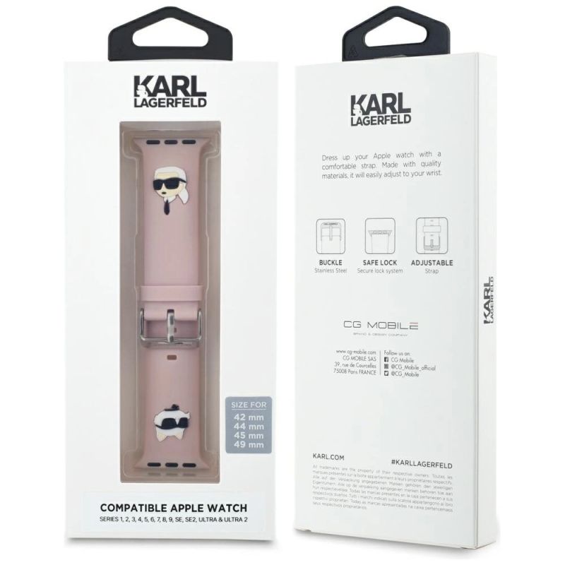 Collection 3D Rubber Karl&Choupette Head Type Apple Watch strap Material Silicone/Stainless Steel Color Pink Compatibility Apple Watch 42/44/45/49 mmSeries 1/2/3/4/5/6/7/8/9/SE/SE2/Ultra/Ultra2