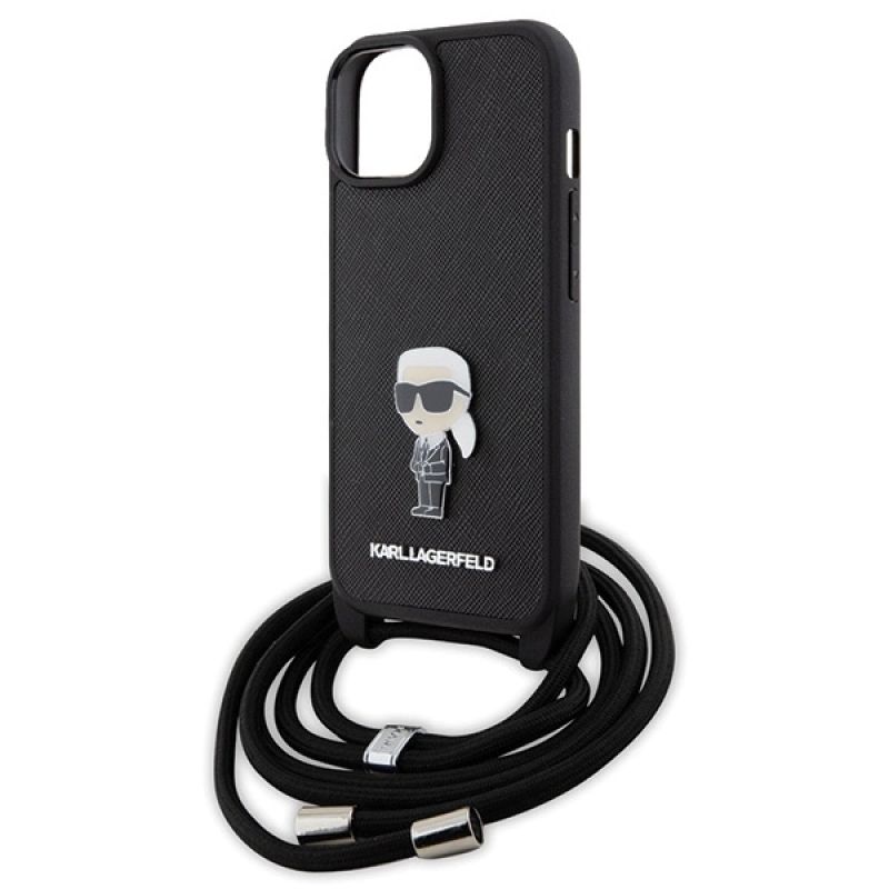 Karl Lagerfeld Crossbody Saffiano Monogram Metal Pin Karl & Choupette Case for iPhone 15 - Black