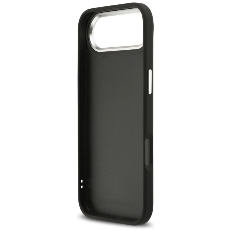 The back is adorned with a distinctive metal pin featuring Karl Lagerfeld and his cat Choupette , lending the accessory a unique, fashionable touch. The design is complemented by an aluminum camera bezel and silver-colored side buttons , emphasizing the product's luxurious character. At the bottom, the "Karl Lagerfeld" inscription adds elegance and a touch of style.