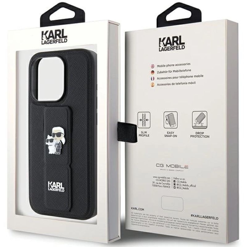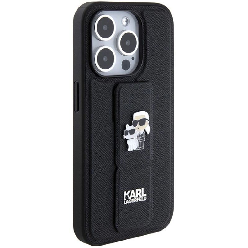 Karl Lagerfeld Gripstand Saffiano Karl&Choupette Pins case for iPhone 15 Pro Max - black