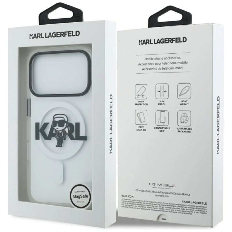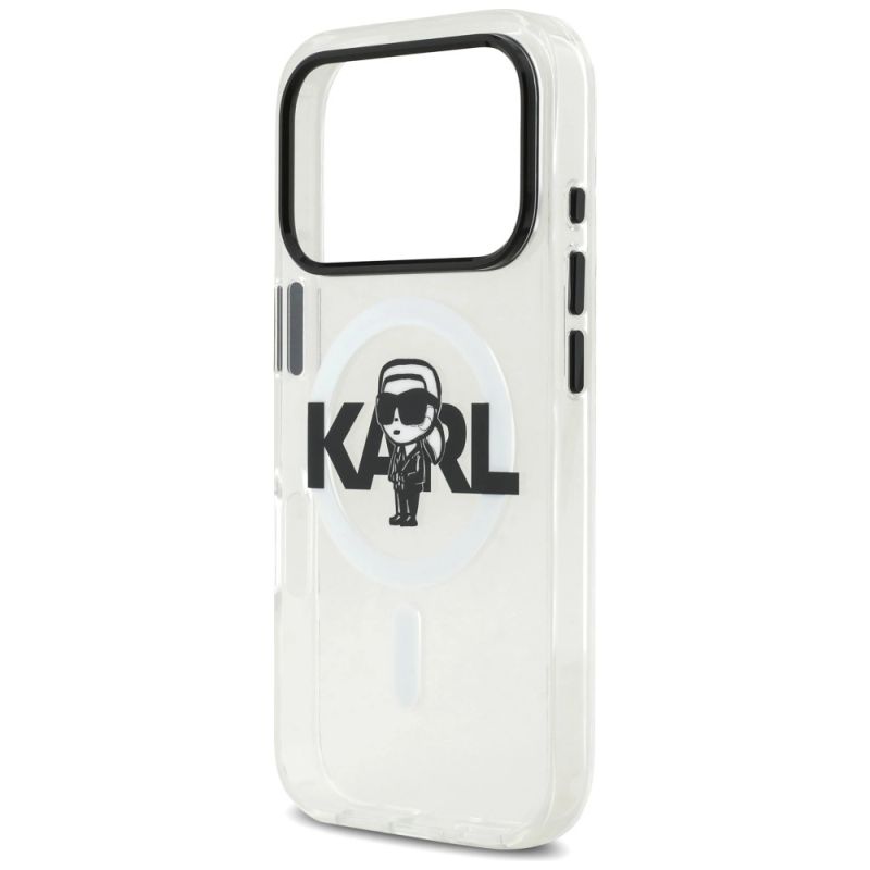 The back is decorated with a printed Karl Lagerfeld motif with a large KARL inscription , complemented by a visible MagSafe ring .
