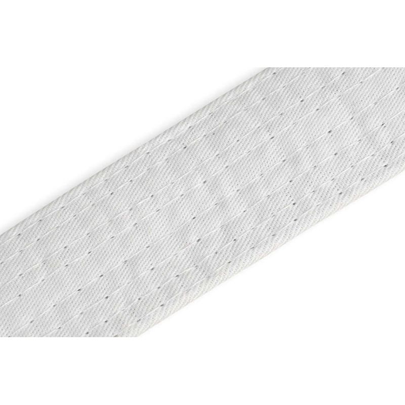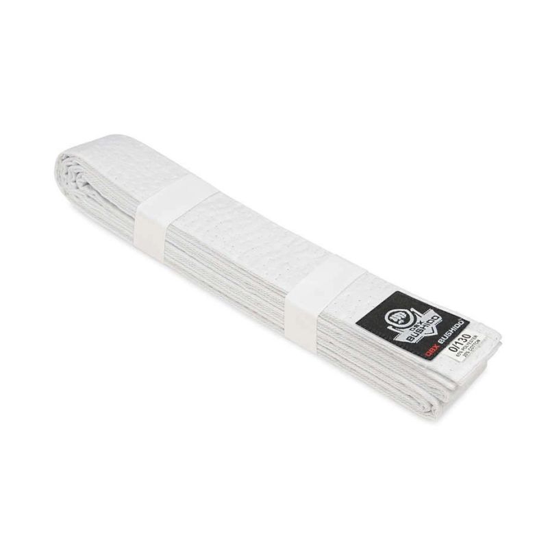 A white belt for combat sports kimonos, made of a material blend of polyester and cotton, providing resistance to abrasion and tearing.