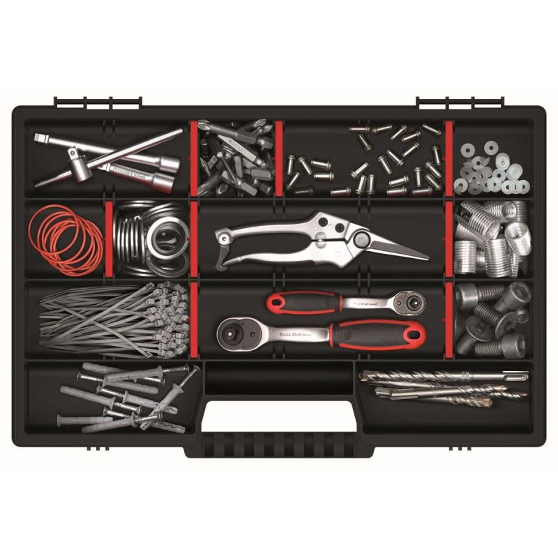 The Organizer has 15 removable compartments, thanks to which you can adjust the size and number of compartments to the type and size of the tools stored, and the convenient transparent lid allows you to see things without opening the lid.