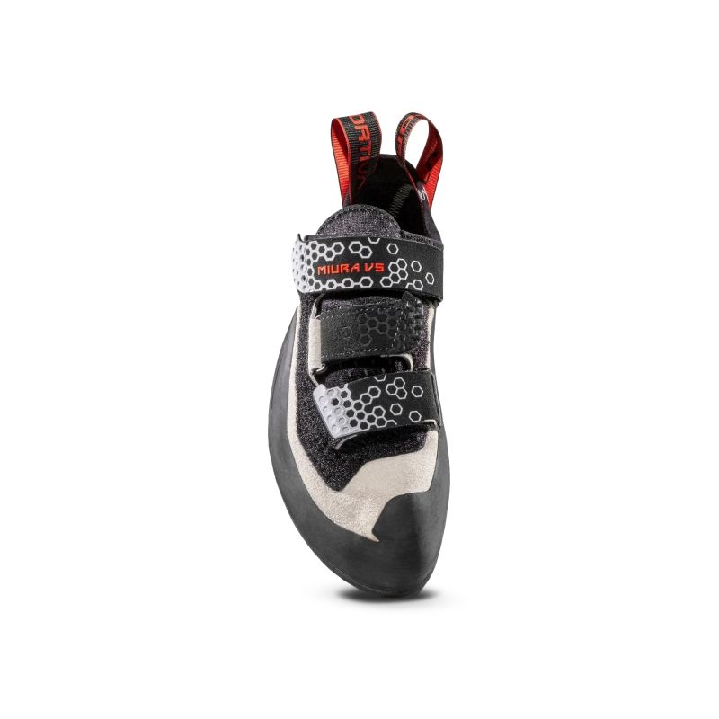 The La Sportiva Miura VS Woman White/Cherry Tomato is an advanced women's climbing shoe designed for sport climbing, bouldering, and technical rock climbing. This model is one of La Sportiva's most recognizable designs, and has been valued for years for its exceptional precision and effectiveness on small steps.