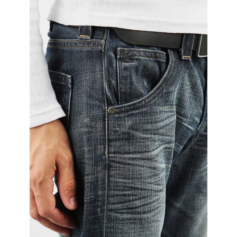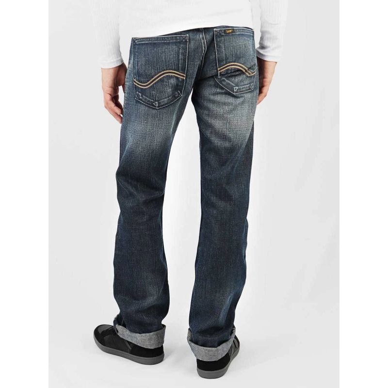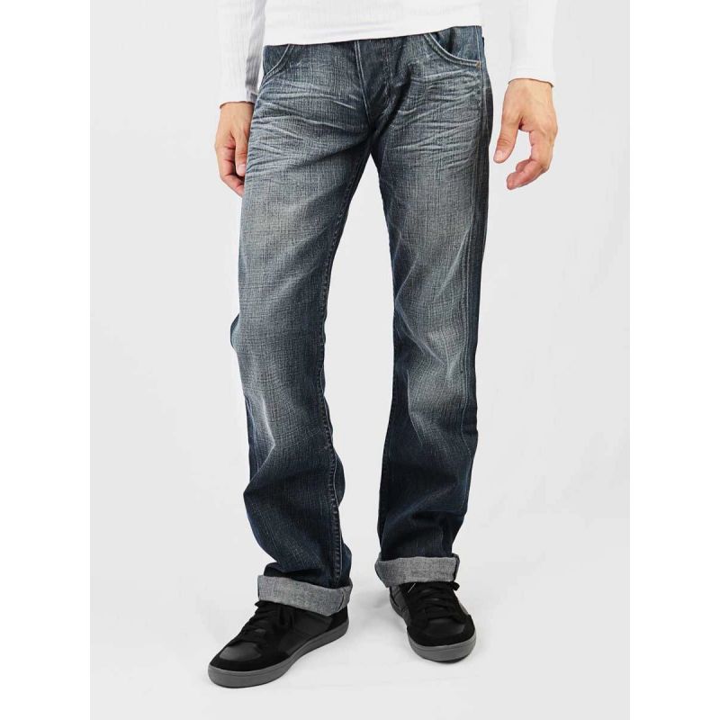 Men's low-rise jeans with flared legs. Button closure. Leather logo patch on the back of the waistband.