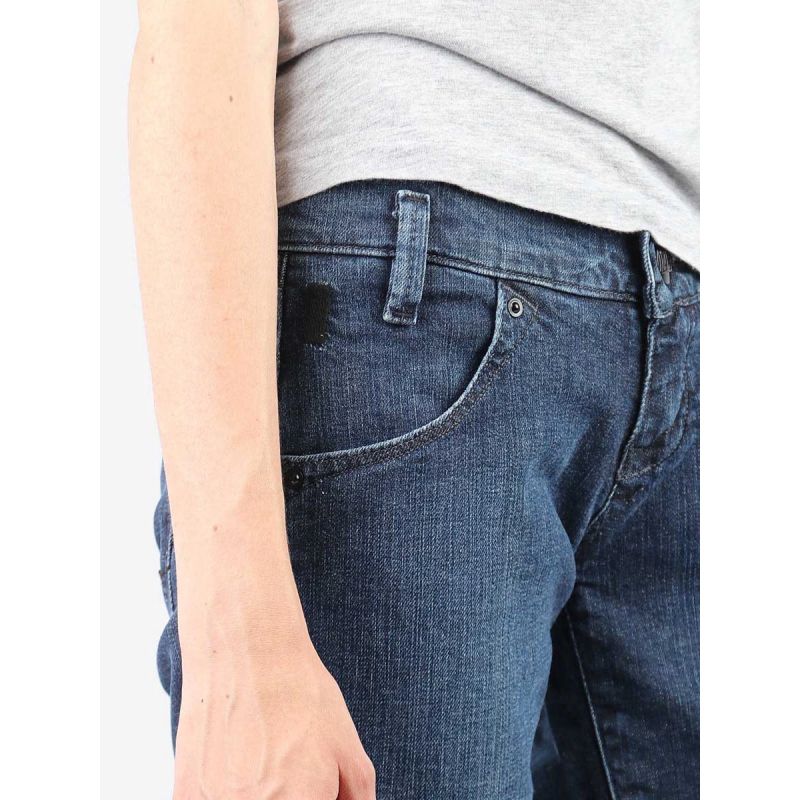 Women's dark blue denim jeans. Straight legs. Button and zipper closure.