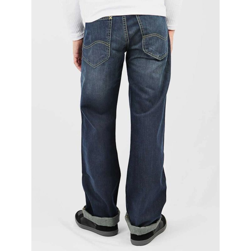 Men's high-waisted, wide-leg jeans with a zipper closure. A brand logo patch is featured on the back. Material: 100% Cotton