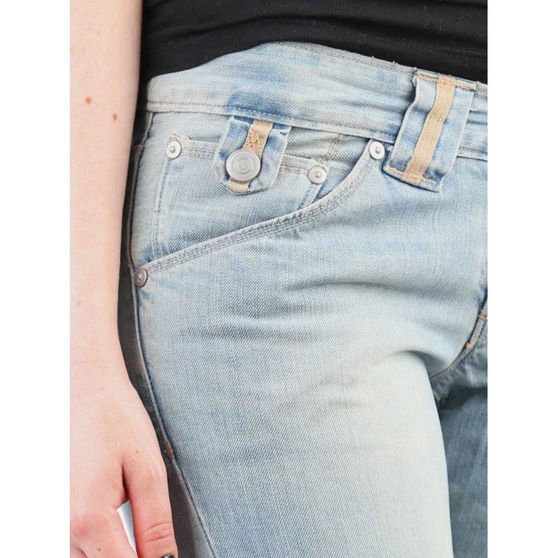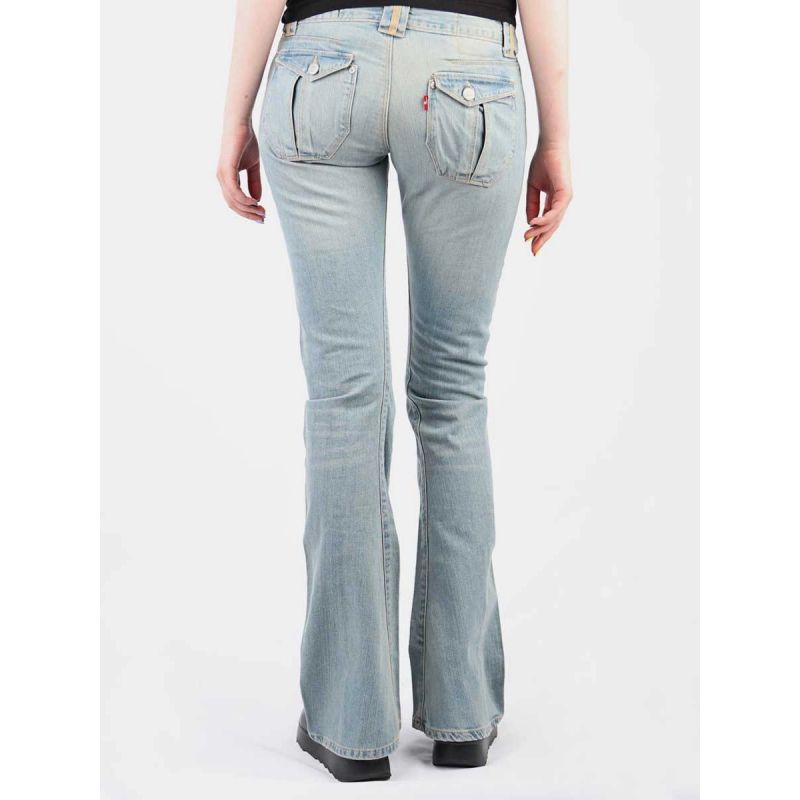 Women's low-rise, wide-leg jeans with a zipper and button closure.