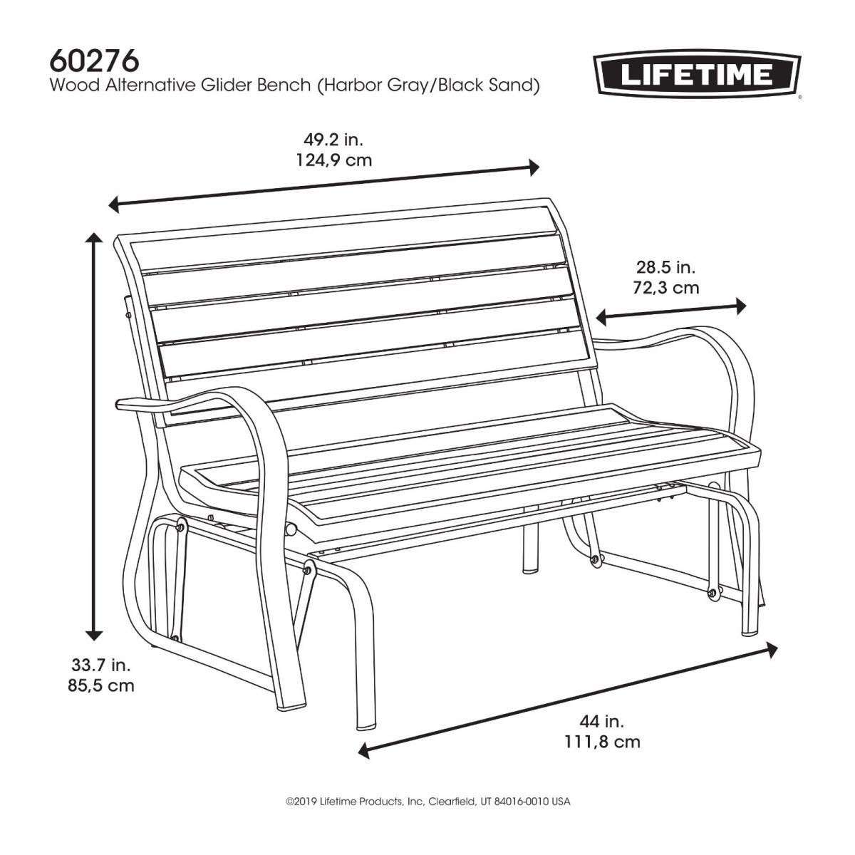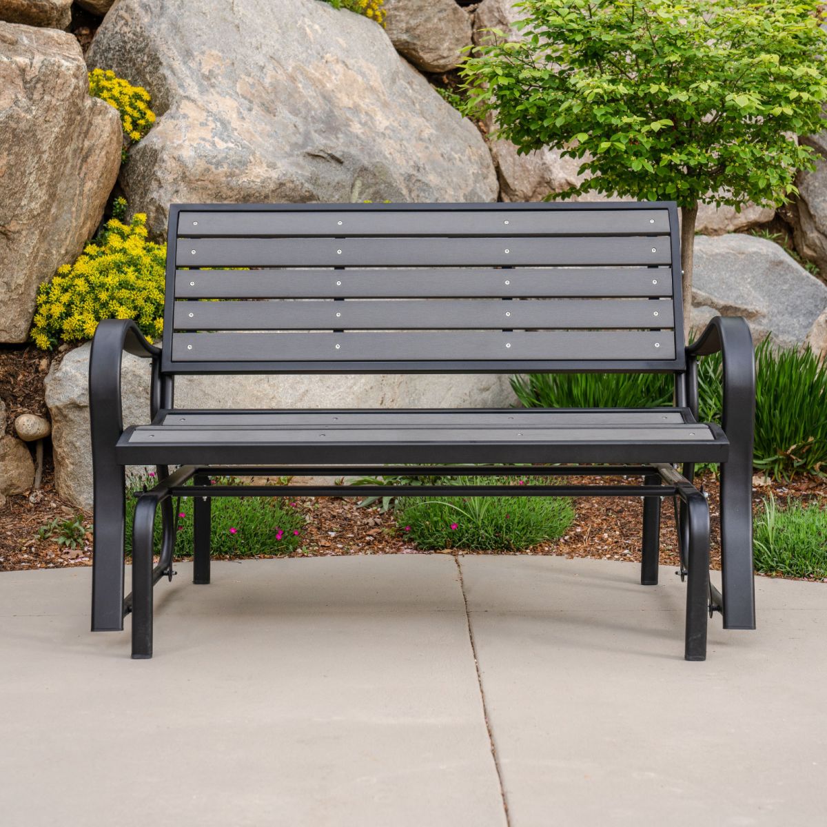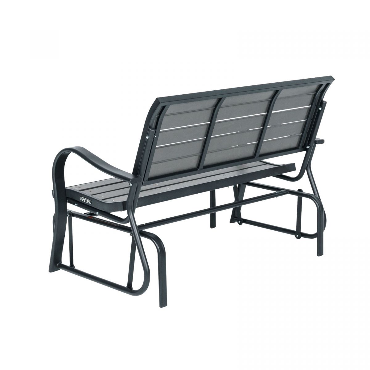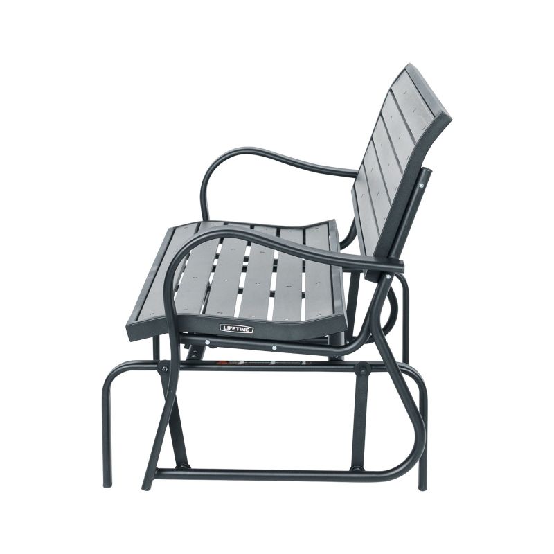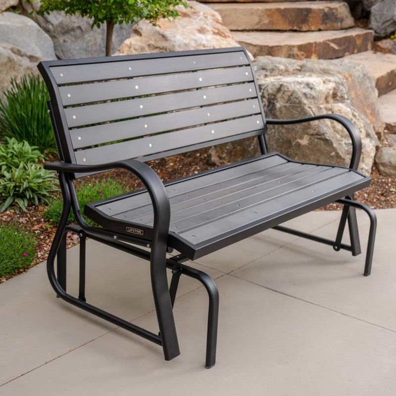 - This Lifetime rocking bench is the perfect addition to your garden, creating a relaxing spot for relaxing afternoons. Crafted from weather-resistant polystyrene with a wood-effect finish, the rocking bench is UV-protected, so it won't fade, crack, or peel. Unlike wooden benches, polystyrene doesn't splinter and never requires painting or varnishing. The steel frame has an anti-corrosion coating, ensuring the bench will last for years to come.