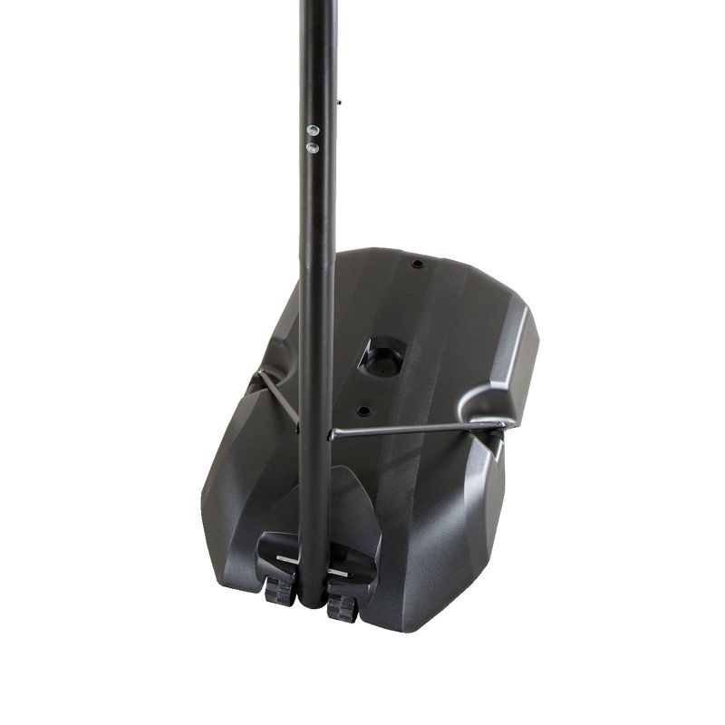 This portable basketball stand features a 48-inch backboard made with Steel-Framed Shatter-Proof technology. Shatter-Proof technology guarantees long-term durability and impact resistance thanks to a coating of the highest quality Makrolon® polycarbonate. Steel-Framed is a durable steel backboard frame. Additionally, protection for the backboard's bottom edge and Speed Shift® height adjustment technology, which allows for a single-handed height adjustment from 244 to 305 cm, ensure comfortable and safe play at any skill level. A durable rim with a flexible, tilting Slam-It® mechanism based on a double spring system, a weather-resistant nylon net, and a 7.62 cm diameter round pole complete the look. Transport rollers mounted on a stable base with a capacity of 128 liters, which can be filled with water or sand, ensure complete mobility and stability.