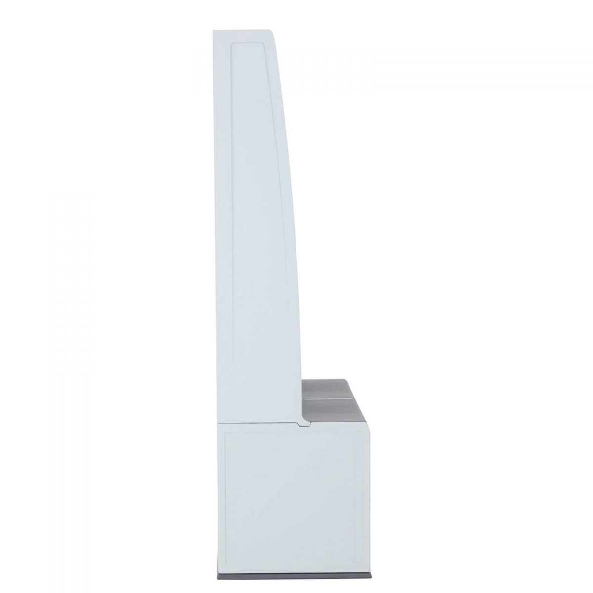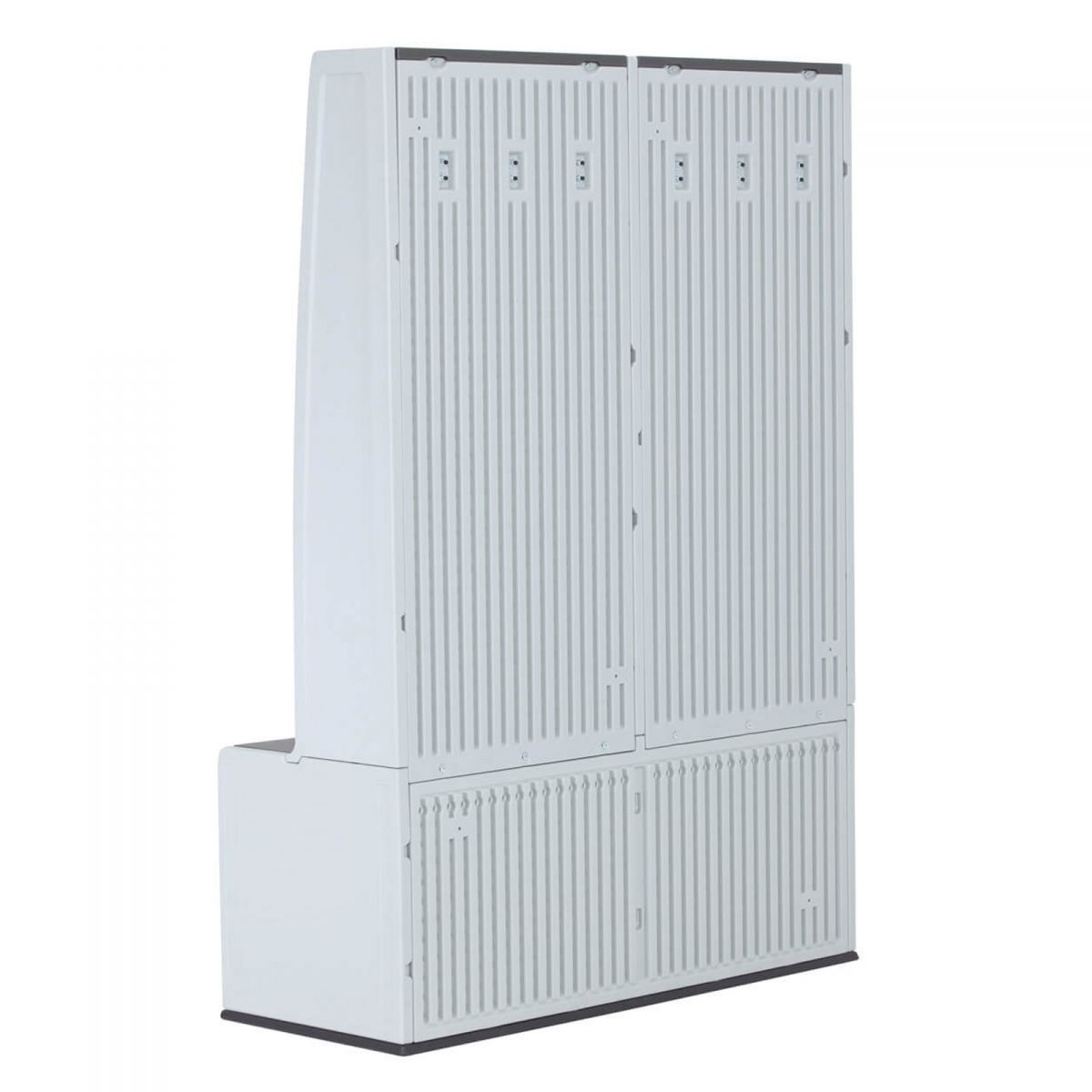 - The storage locker has 6 hooks on which you can hang your clothes, 2 built-in shoe shelves, and 2 opening benches that will surprise you with their capacity.