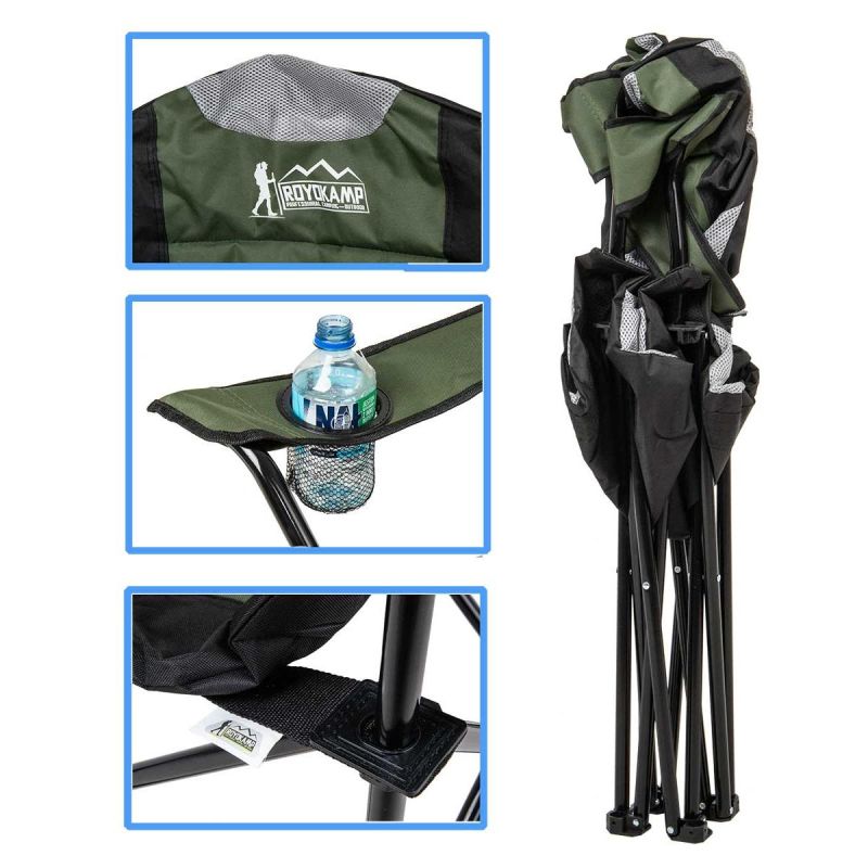 A FOLDING CAMPING CHAIR with space for drinks or a phone is essential for a successful camping trip, vacation, beach, lake, or simply a day at the garden. Thanks to its easy-to-use "spider leg" design, it's ready whenever you need it, as this folding and unfolding system is a snap. The OXFORD fabric of the seat and backrest provides high durability and water resistance , as it resists abrasion, stretching, and tearing. Easy to clean, simply wipe with a damp cloth if dirty. The chair's ergonomic design will ensure you sit comfortably for hours, and the comfortable armrests allow you to find a comfortable position, relieving pressure on your spine. The chair's frame, made of solid and durable steel tubing, can support up to 120 kg!