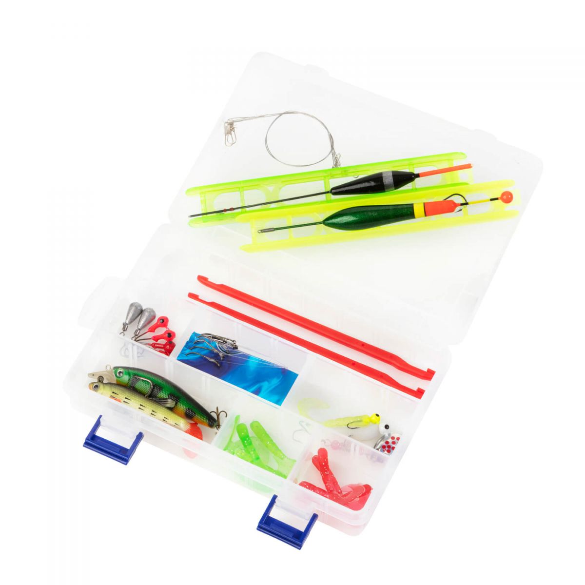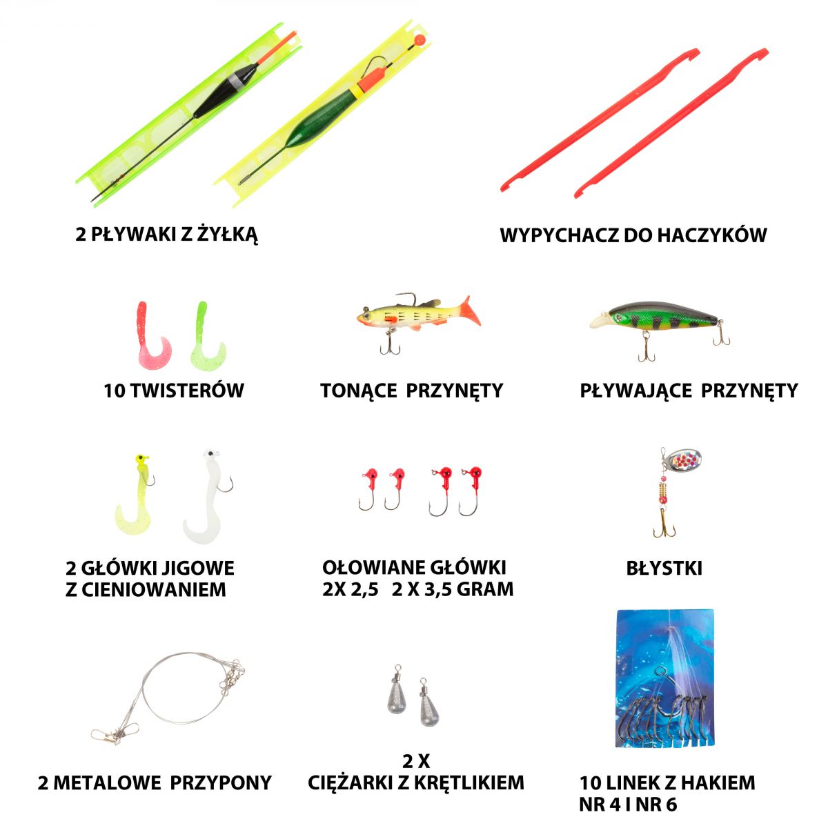 The accessory box contains: floats, spinners, hooks, sinkers, baits with hooks, twisters