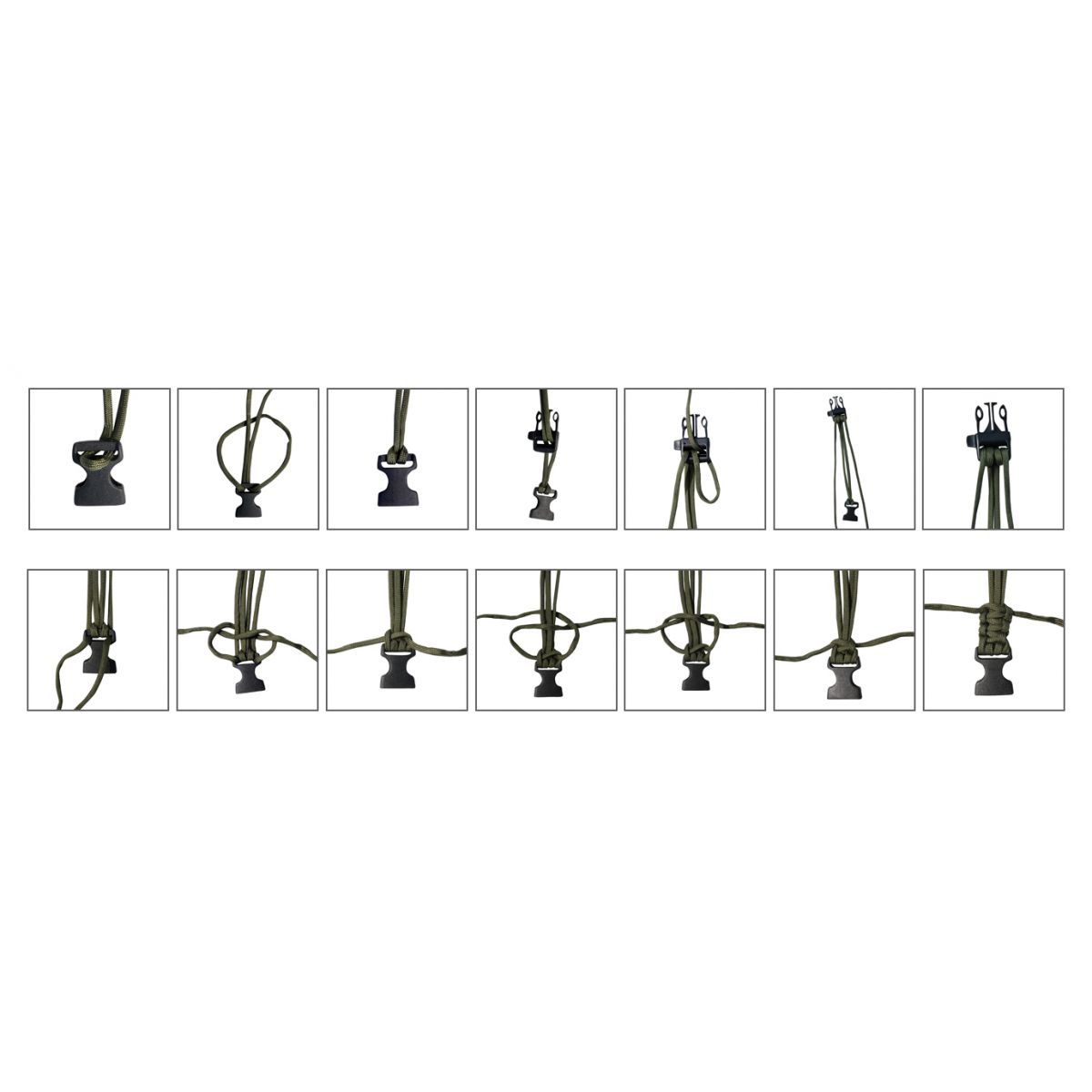 1. Fold the cord in half and pass the loop from the back through the buckle without the whistle. 2. Pass the remaining cord through the loop. 3. Tighten. 4. Pass the free end of the cord through the second buckle from the back. Position the buckle so that the whistle is on the left. 5. Pull the free end of the right cord from front to back, next to the previously passed cord. 6. Repeat step 5 for the left end of the cord. 7. Make sure the cords are arranged as shown in the image. 8. Pass the two free ends through the first buckle from the back. Adjust the distance between the clasps. This length will determine the length of the bracelet. The recommended length is approximately 11 cm. 9. Pass the right end of the cord over the bracelet. Pass the left end under it. Make sure the ends pass through the created loops as shown in the image. 10. Tighten 11. Reverse step 9. Pass the left end over the bracelet and the right end under it. 12. Insert the free ends into the resulting loops as shown in the picture. 13. Tighten 14. Repeat steps 9-13 until the entire bracelet is formed.