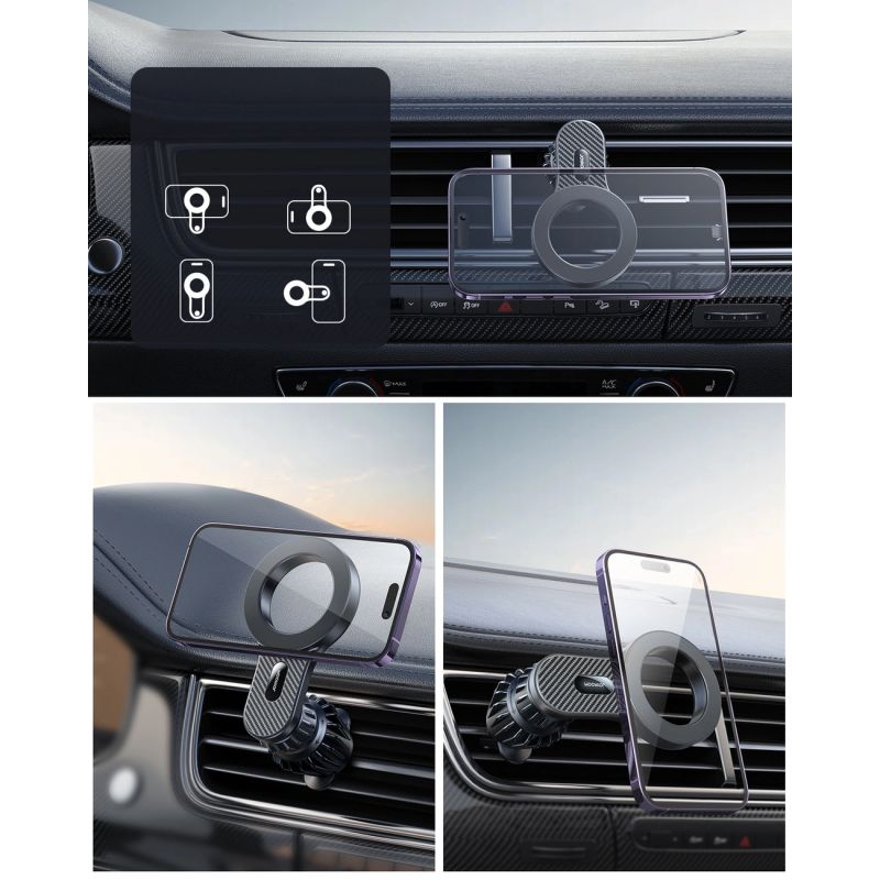 The iPhone car holder with MagSafe from Joyroom has built-in neodymium magnets that ensure a very stable attachment of the smartphone to the holder. The holder is intended for installation on classic air vents. The swivel arm provides complete installation freedom, so you will avoid covering selected elements of the dashboard.