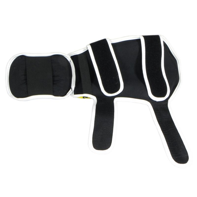 Fastened with 2 Velcro straps on 5 cm wide eco-leather straps and one permanently sewn-in elastic band 2 cm wide
