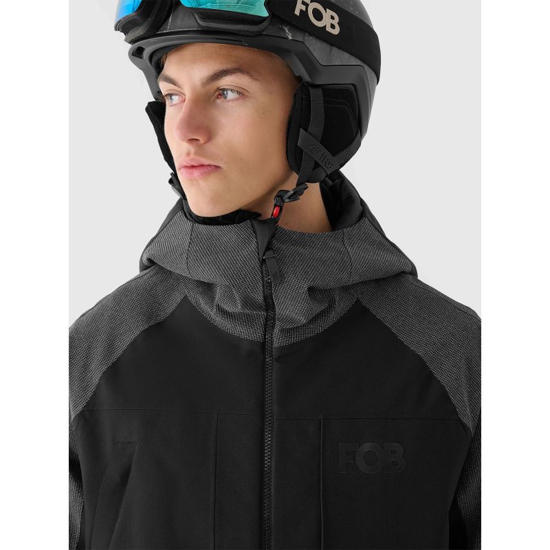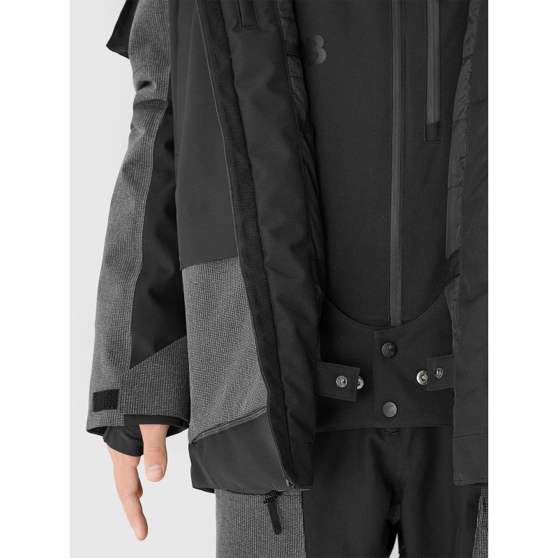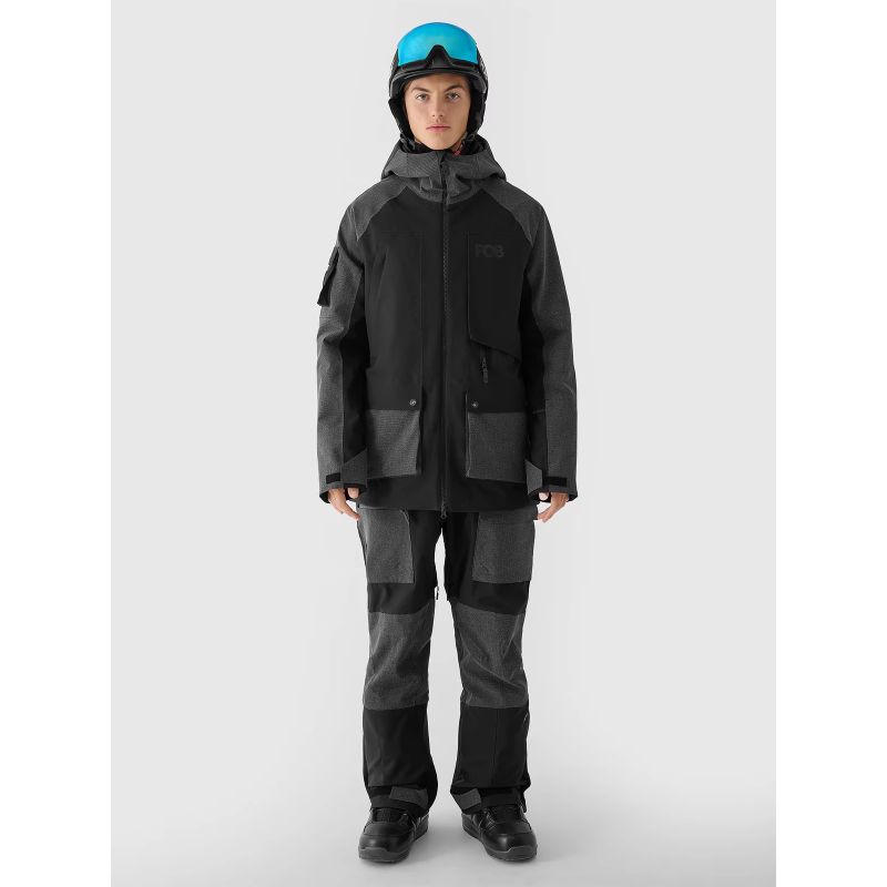 This men's snowboard jacket features a two-way, waterproof main zipper with an internal wind flap to prevent cold air from entering the jacket. Reflective elements enhance visibility and an integrated powder skirt with snap adjustments prevents snow from entering.