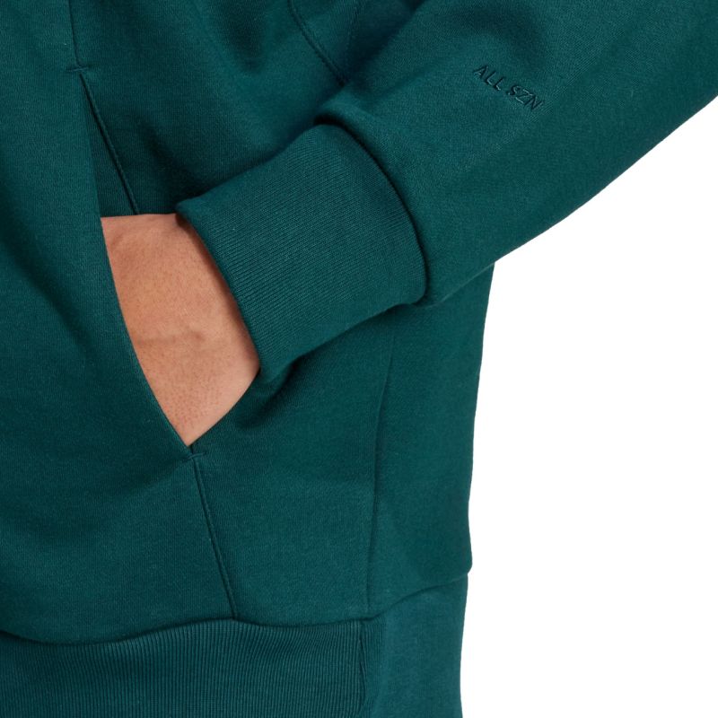 Men's adidas ALL SZN Fleece Full-Zip Sweatshirt, Green JX5101. This adidas men's sweatshirt is perfect for everyday wear. Soft, cotton fabric with added polyester fibers. Fleece lining softly hugs the skin for warmth. Relaxed fit. Non-adjustable hood. Elastic cuffs and hem. Open side pockets. Full-length zipper. Material: 70% cotton, 30% polyester