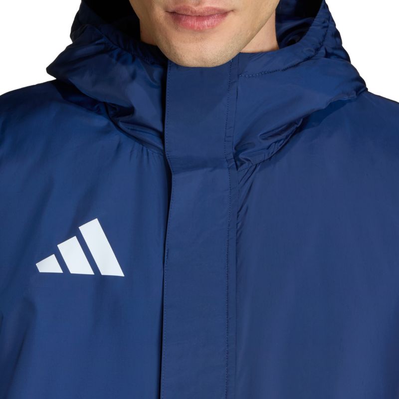 adidas Entrada 26 Stadium Jacket Navy Blue JZ6669 This adidas men's jacket is designed for relaxing on the sidelines. It features a regular-fit, full-zip design. A fixed hood. Zippered side pockets. Cuffed cuffs. A storm flap with snaps. Synthetic insulation. Outer fabric: 100% recycled polyester. Filling: 100% recycled polyester.