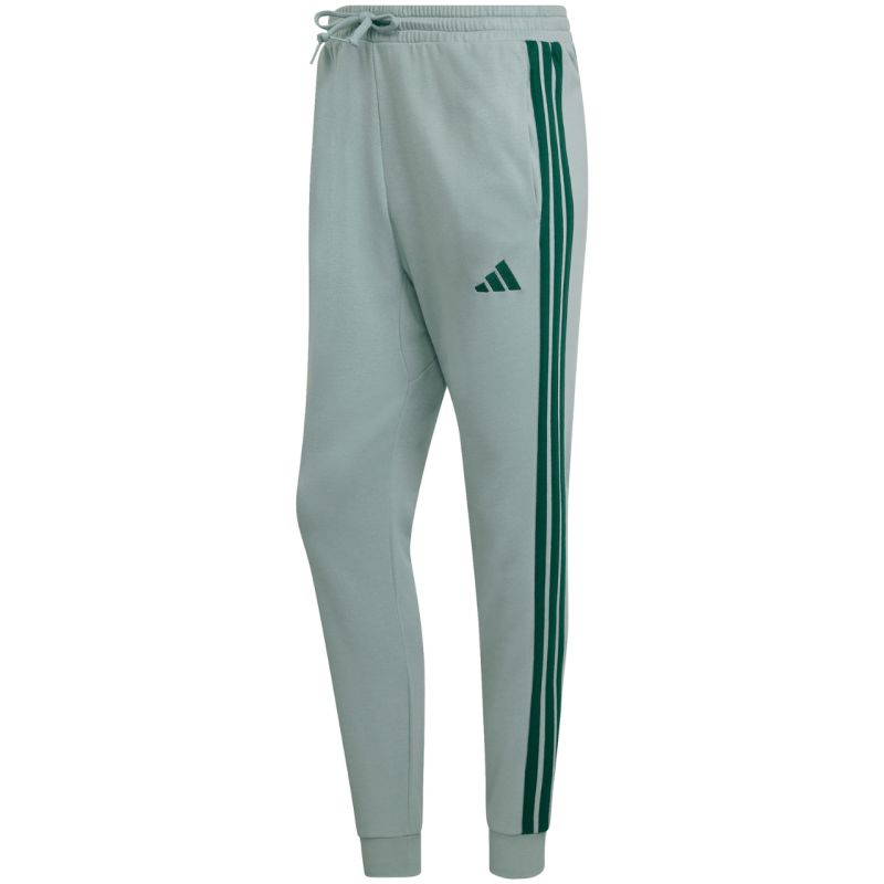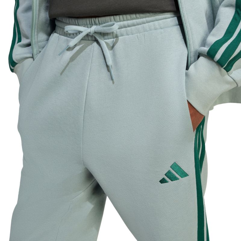 Men's adidas Essentials 3-Stripes Fleece Pants Mint KD4836. These men's adidas pants with tapered legs offer unrestricted movement, ensuring full mobility and comfort in every position. They feature a soft cotton and polyester blend. Internal padding. Elastic cuffs at the lower legs. Waistband with an external drawstring for adjustment. Open pockets. A sporty design features stripes on the legs and a discreet adidas logo. Material: 55% cotton, 36% recycled polyester, 9% viscose.