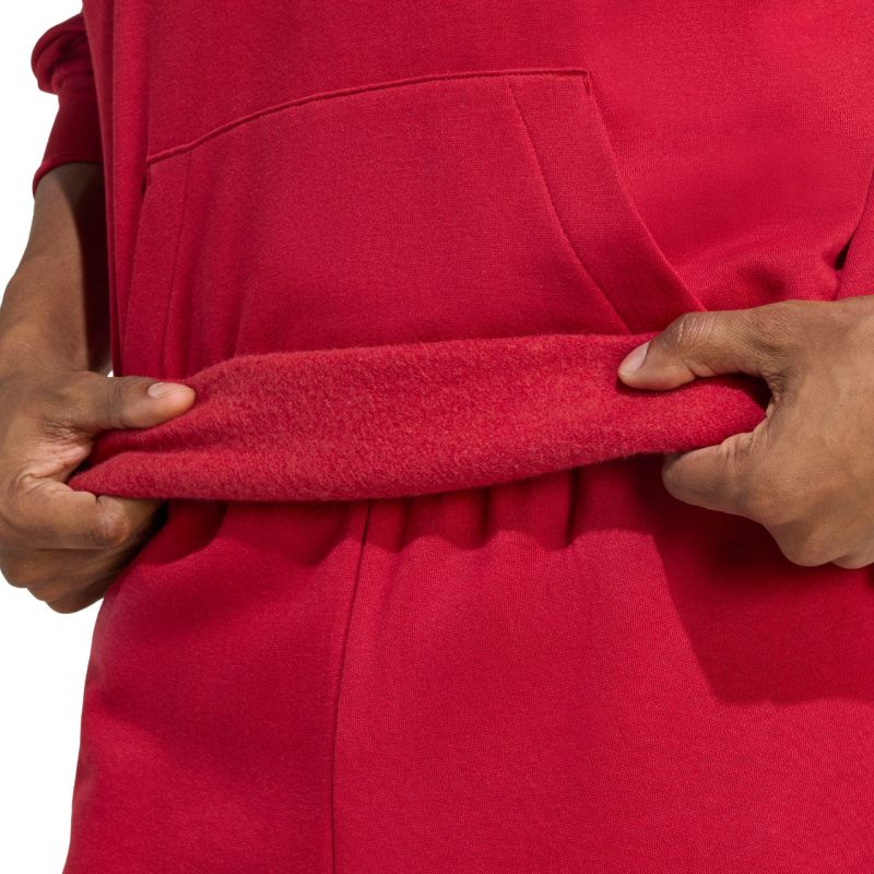 Men's adidas Essentials Feelcozy Hoodie Red KC0907. This men's adidas sweatshirt showcases a modern, sporty style perfect for everyday wear. The soft cotton-blend construction with added polyester fibers. The standard fit with a slightly cropped back hem provides mobility. Ribbed cuffs and hem help prevent heat loss. The adjustable hood features a front pocket. Softly lined interior. Material: 70% cotton, 30% recycled polyester.