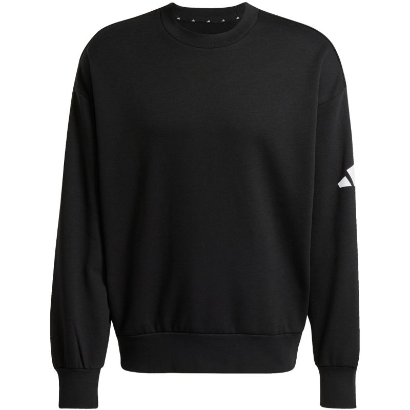 Men's adidas Essentials Loose Fit 3 Bar Logo Sweatshirt, Black JF3542. This men's adidas sweatshirt showcases a modern, sporty style perfect for everyday wear. It's made of a soft cotton blend with added polyester fibers. The loose fit allows for mobility. Ribbed cuffs and hem help prevent heat loss. Softly lined interior. Large logo on the sleeve. Main fabric: 55% cotton, 36% polyester, 9% viscose. Rib: 95% cotton, 5% elastane.