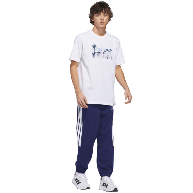 adidas Summer Sunset Graphic Men's T-Shirt, White JZ7544. This men's adidas T-shirt features a regular fit and is made of lightweight, breathable single jersey fabric for everyday comfort. The soft material fits snugly and is perfect for warmer days. The "Summer Sunset" graphic adds a casual, summery feel, while the adidas logo emphasizes the sporty feel and quality craftsmanship. Material: 100% cotton
